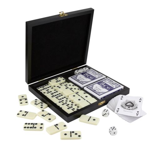 SET DE JUEGO ARUA(Incluye caja de madera, dominó con 28 piezas, 2 barajas y 5 dados.)