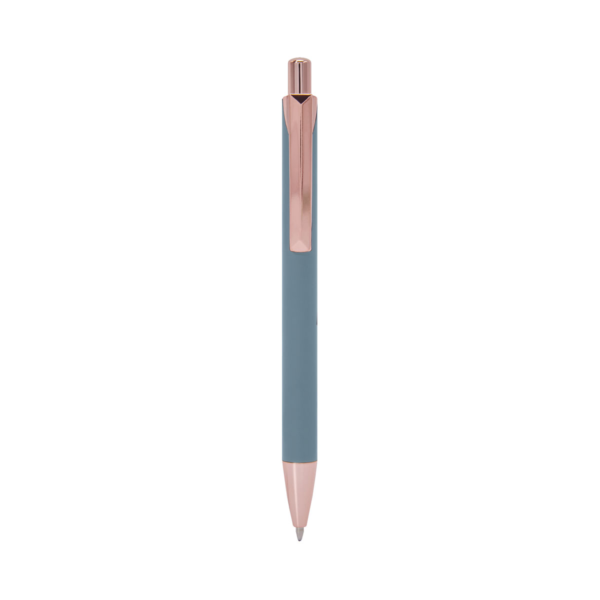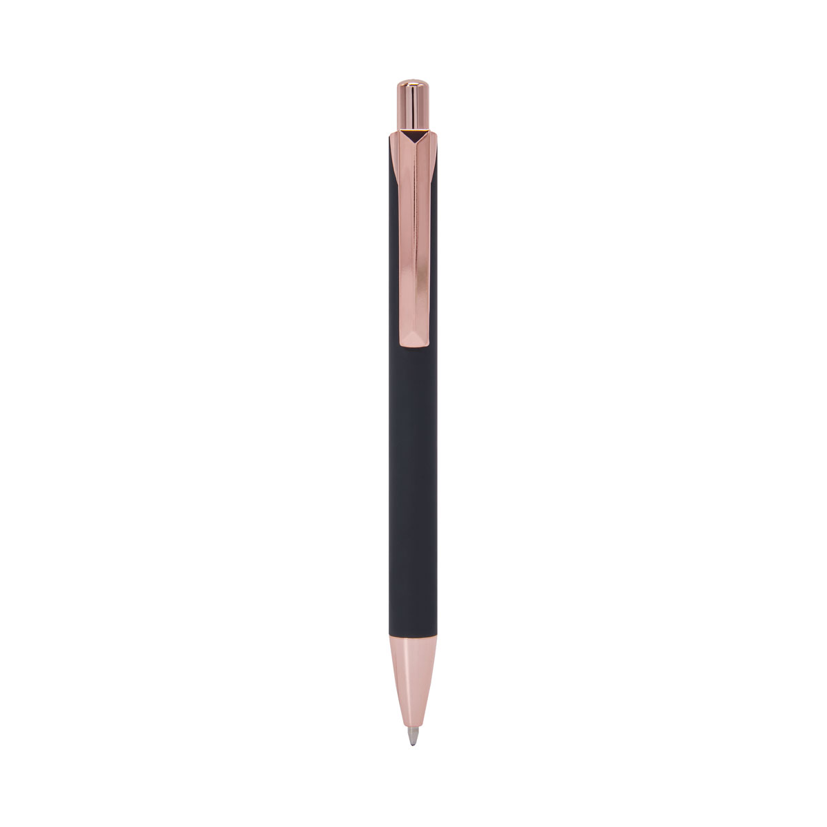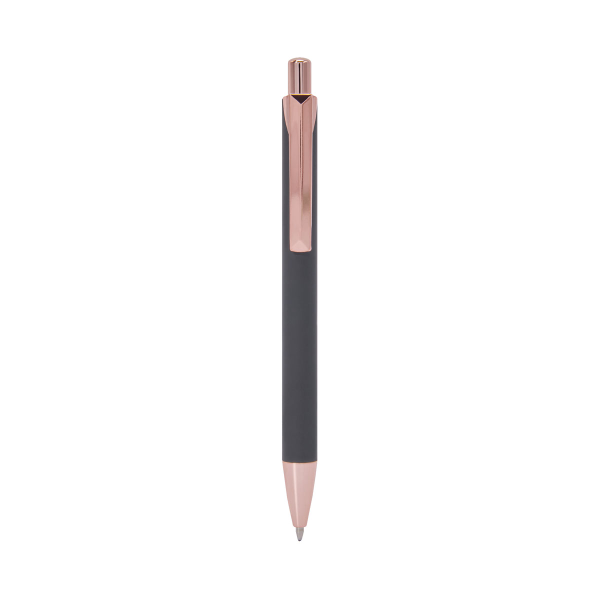 BOLíGRAFO TIFT(Bolígrafo metálico con terminado tipo rubber. Botón, clip y punta en rose gold. Mecanismo pulsador. Incluye funda.)