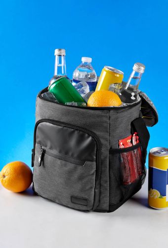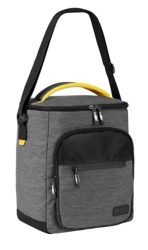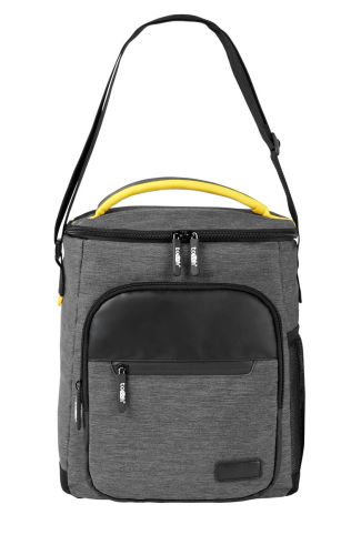 HIELERA GRIS CON AMARILLO(Hielera con interior plastificado y sellado. Doble bolsillo frontal con cierre, bolsillo lateral de malla, incluye asa superior acolchada y correa ajustable.)