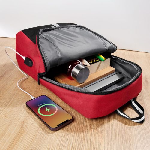 Bolsa principal con cierre, compartimento para laptop y bolsillo interno para organizar accesorios. Incluye bolsillo lateral de malla y aditamento especial trasero para colocar en trolley. Equipada con un cable USB de carga, solo conecta tu Power Bank en