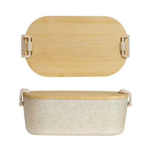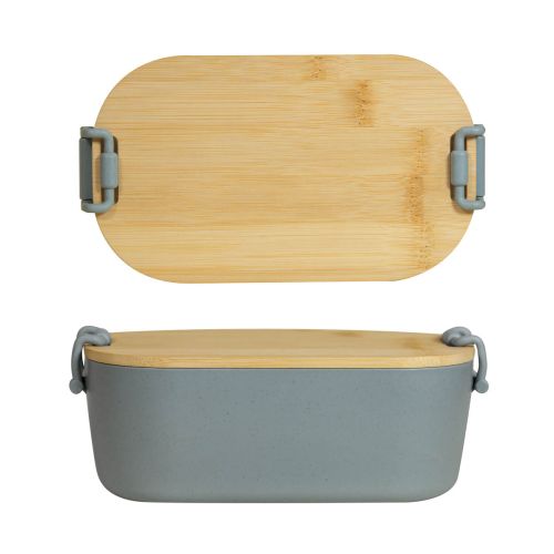 Lonchera de plástico que presenta un toque natural y elegante con su tapa de bambú, la cual se asegura con dos broches de plástico para mantener la lonchera cerrada. En su interior, encontrarás un práctico tenedor y un pequeño contenedor destinado