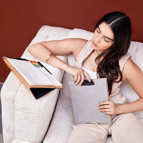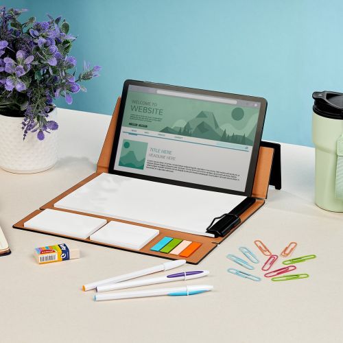 Carpeta planeador con cubierta rígida. Sus hojas blancas ofrecen un lienzo para dibujar, esbozar y escribir. Su diseño plegable la convierte en un práctico soporte para tablet o smartphone. En su interior, cuenta con un block de 40 hojas, dos block