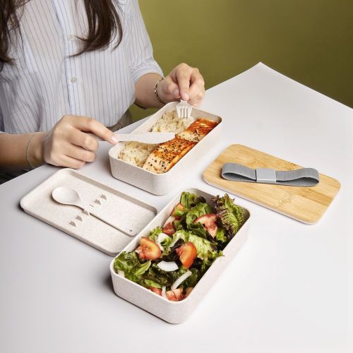 Contenedor de alimentos con doble compartimento. Capacidad total de 1 litro. Incluye tenedor, cuchillo y cuchara. Su fabricación lo hace amigable con el medio ambiente, al incorporar fibra de trigo en sus materiales. La elegante tapa de bambú asegura tus