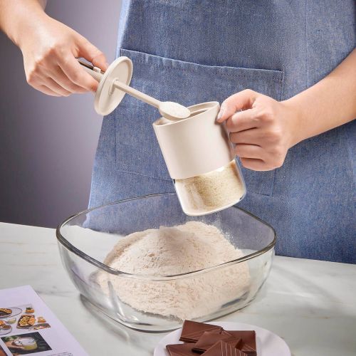 Frasco de vidrio para azúcar u otras especias. Incluye una tapa innovadora con cierre a presión que integra una cuchara retráctil, haciendo que servir y medir sea más sencillo que nunca. Su diseño con rosca permite desprender el frasco de vidrio fá