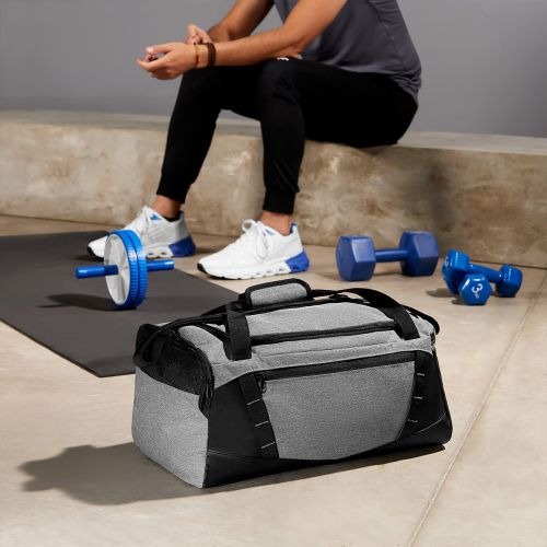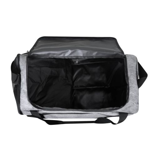 Maleta deportiva equipada con bolsa principal y una adicional en la parte frontal, ambas con cierre. Además, cuenta con un compartimento lateral para calzado yun bolsillo lateral de malla. Incluye correa ajustable para hombro y asas de agarre superior. La