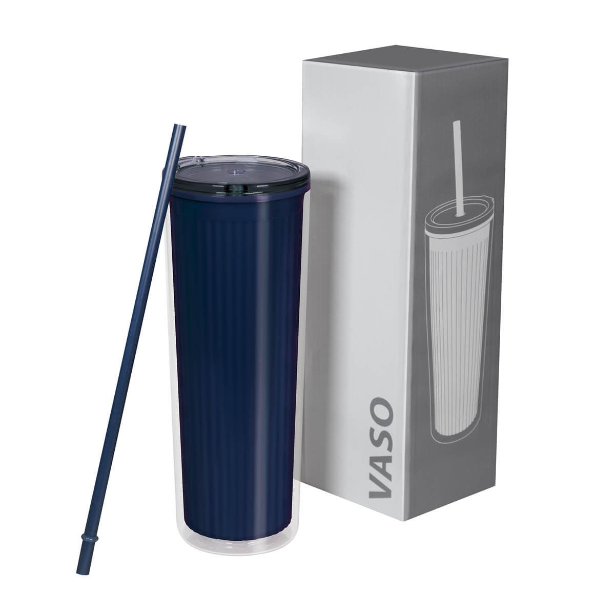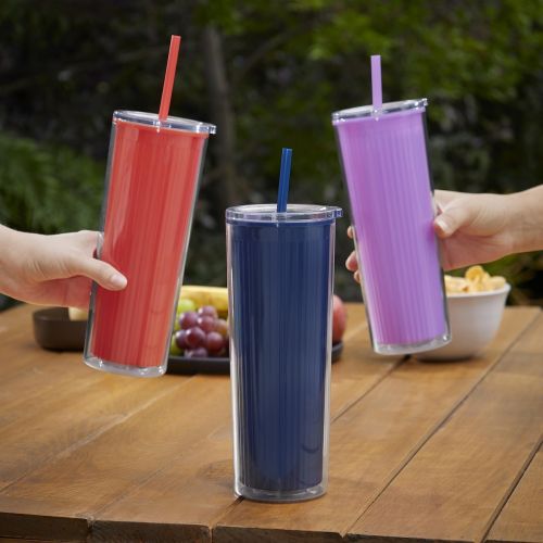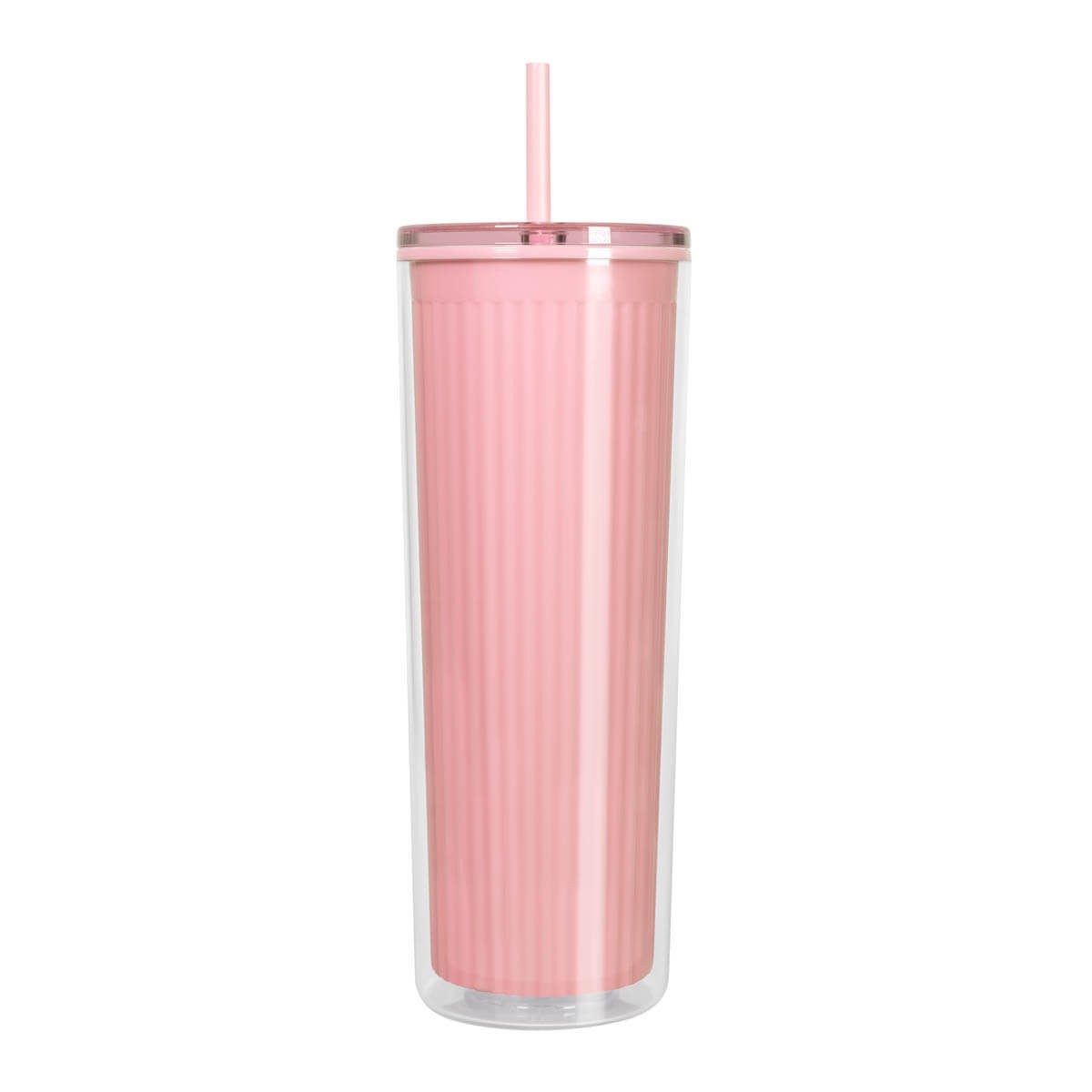 Termo de plástico doble pared. Pared interna de color, texturizada a rayas, y pared externa lisa y transparente que, en conjunto, ofrecen un diseño moderno y vibrante. Incluye tapa de plástico con sistema push y popote a juego que proporciona comod