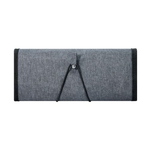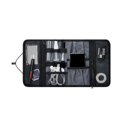 Organizador enrollable para accesorios. Contiene dos compartimentos con cierre y malla, un compartimento intermedio con bandas elasticas y un compartimento con dos bolsillos. Cierre con elastico.