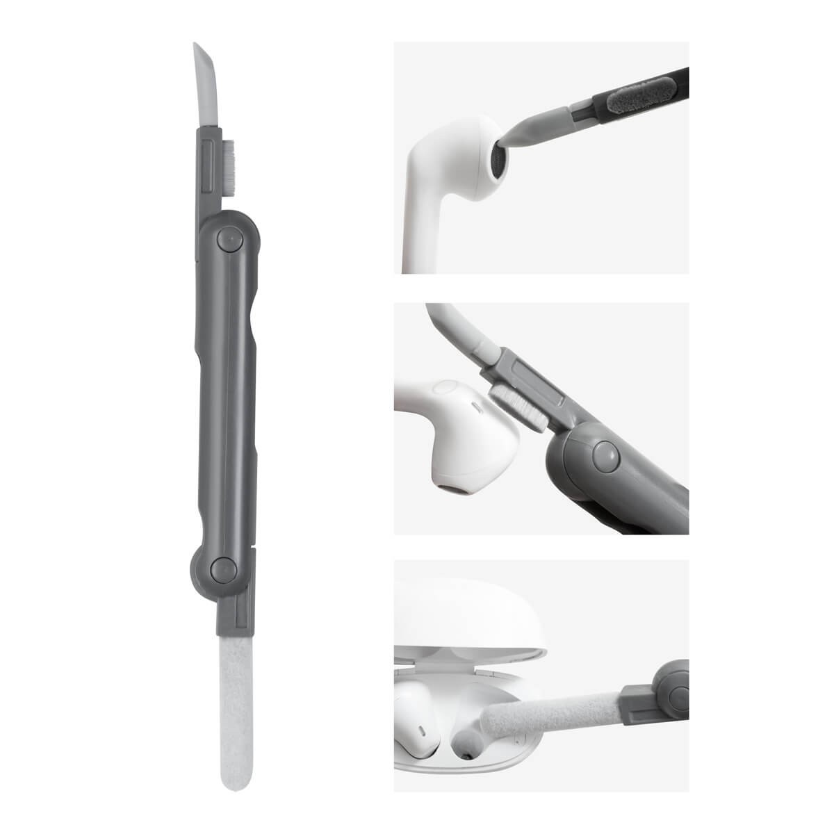 Kit de limpieza para electronicos, gadgets, celulares y mas. Incluye 5 herramientas basicas para mantener tus accesorios favoritos libres de suciedad. Cepillo plegable 3 en 1 para limpiar auriculares. Equipado con punta de silicon, cepillo de esponja y mi
