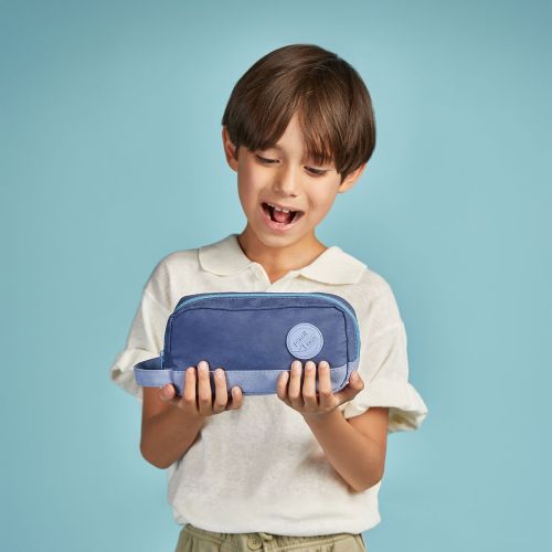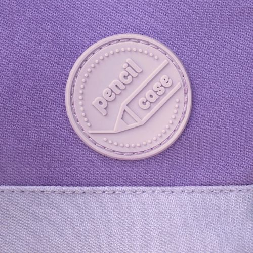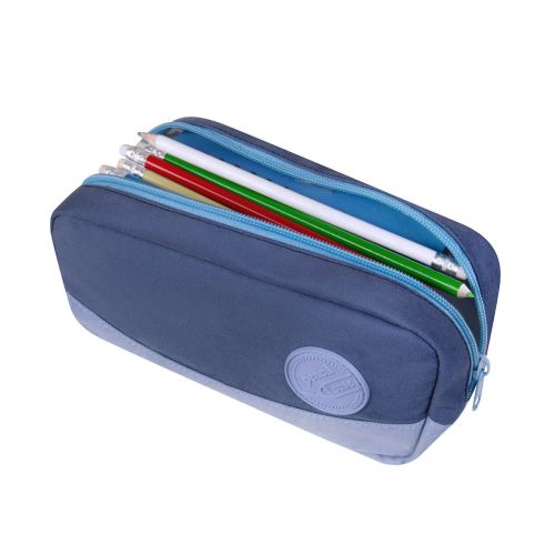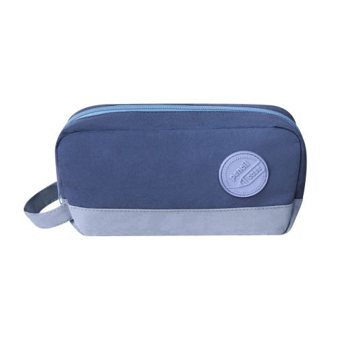 Estuche escolar bitono con asa para sujetar facilmente. Incluye cierre en el compartimento principal, amplio espacio para articulos escolares y un parche decorativo de silicon.
