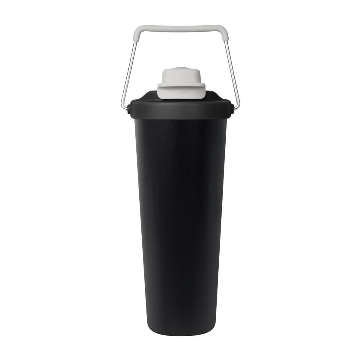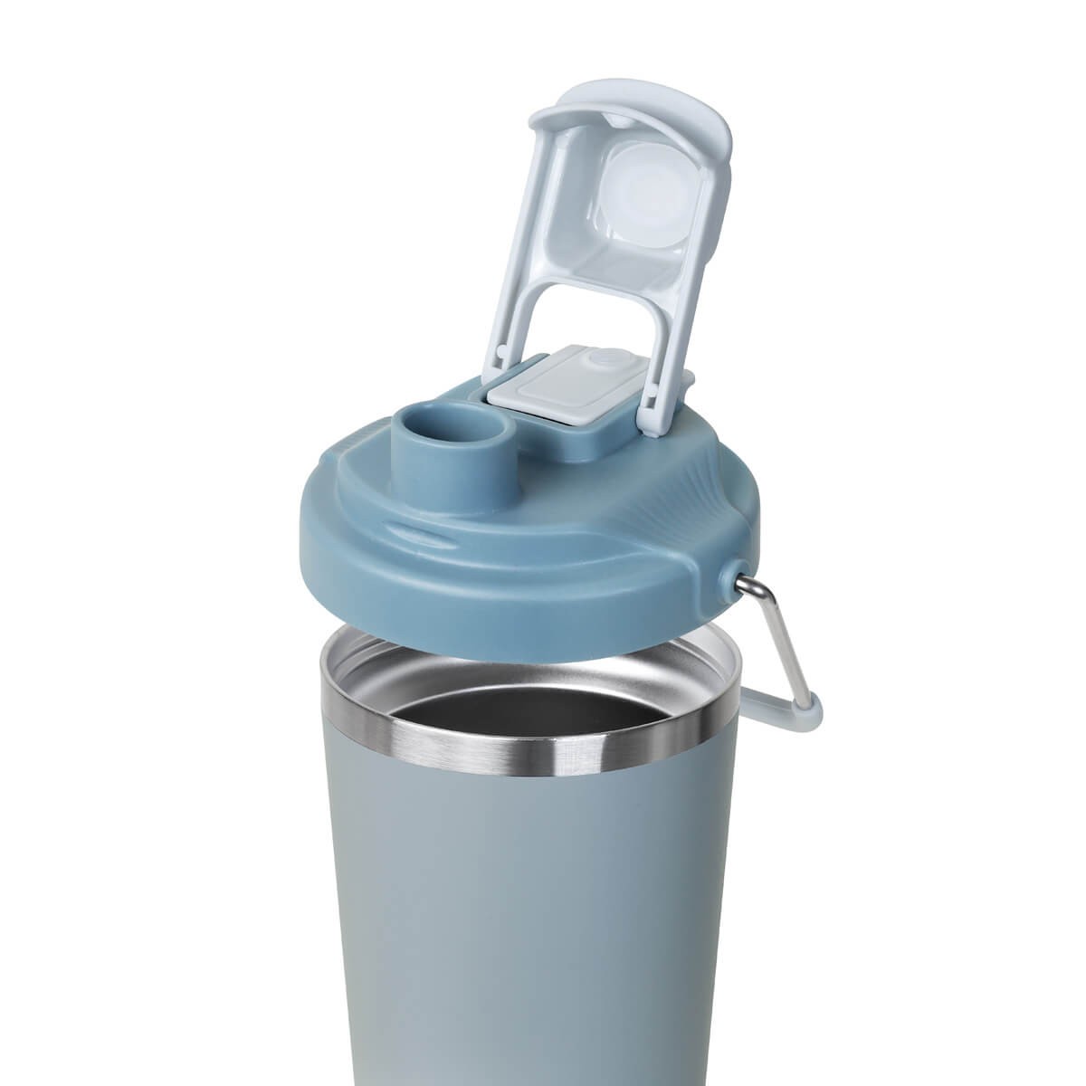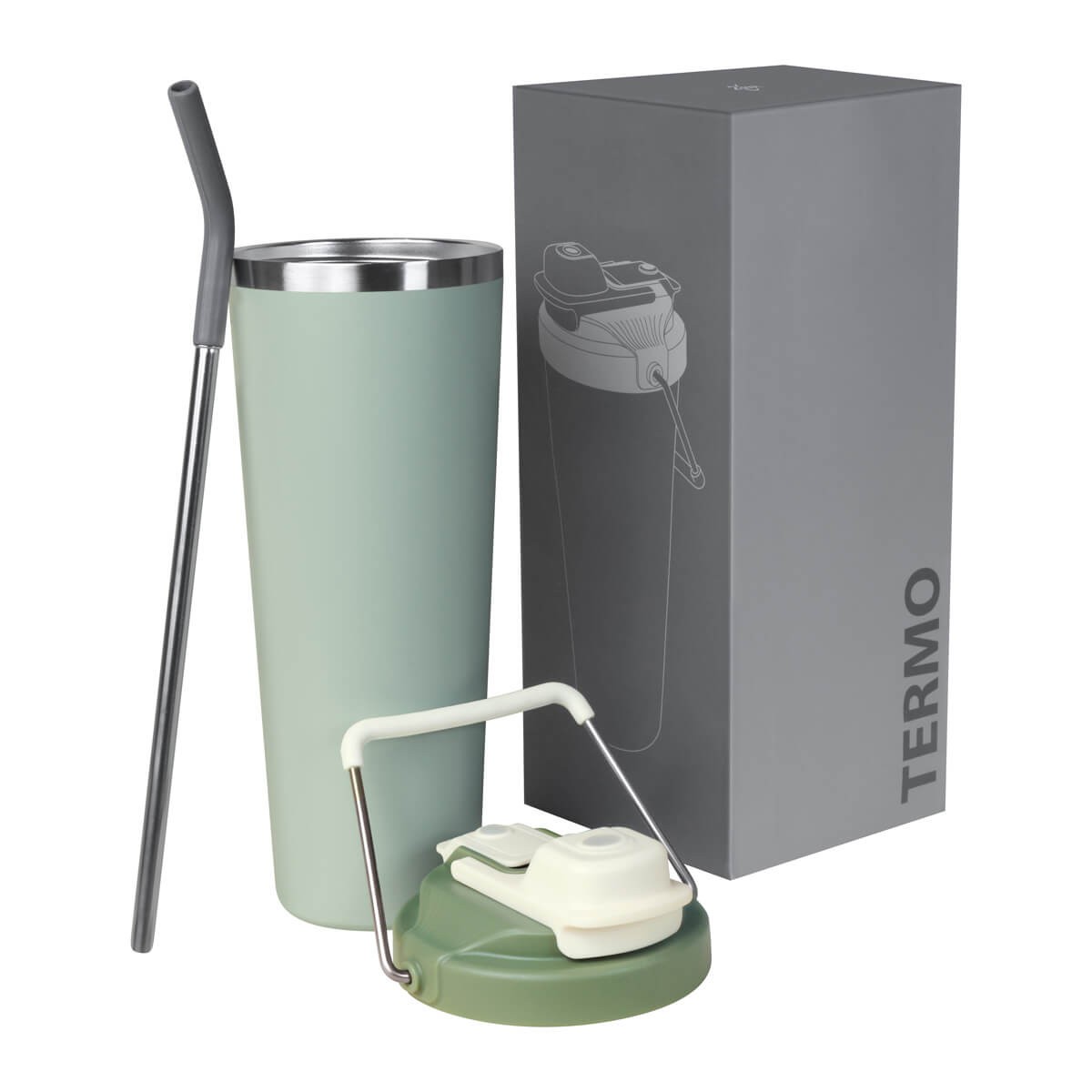 Termo doble pared. Cerrado al vacio. Pared interna y externa acero inoxidable. Cuerpo con terminado rugoso. Tapa de plastico con sistema de rosca y doble sobretapa con cierre push, una con boquilla para beber y otra con ranura para popote. Agrega un asa m