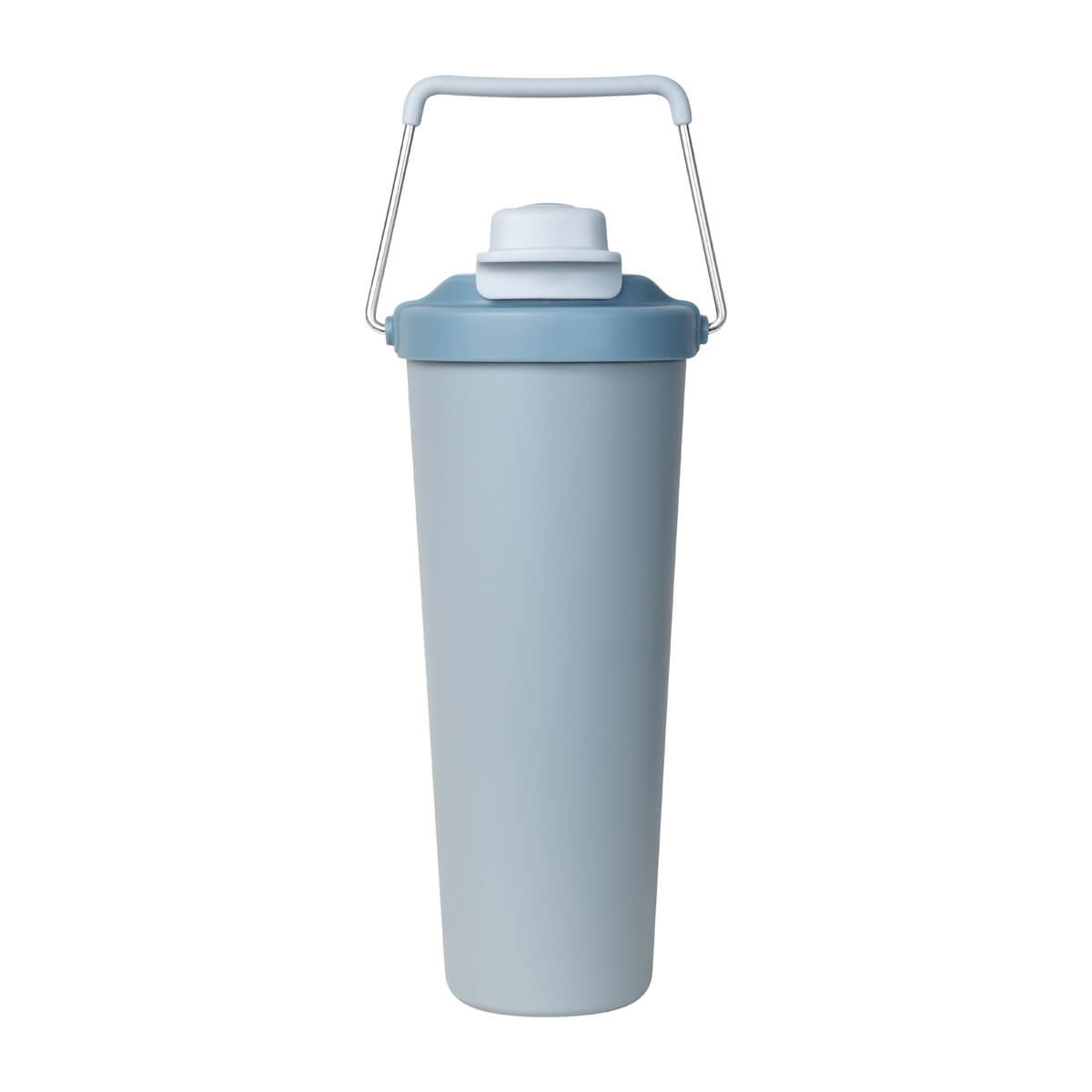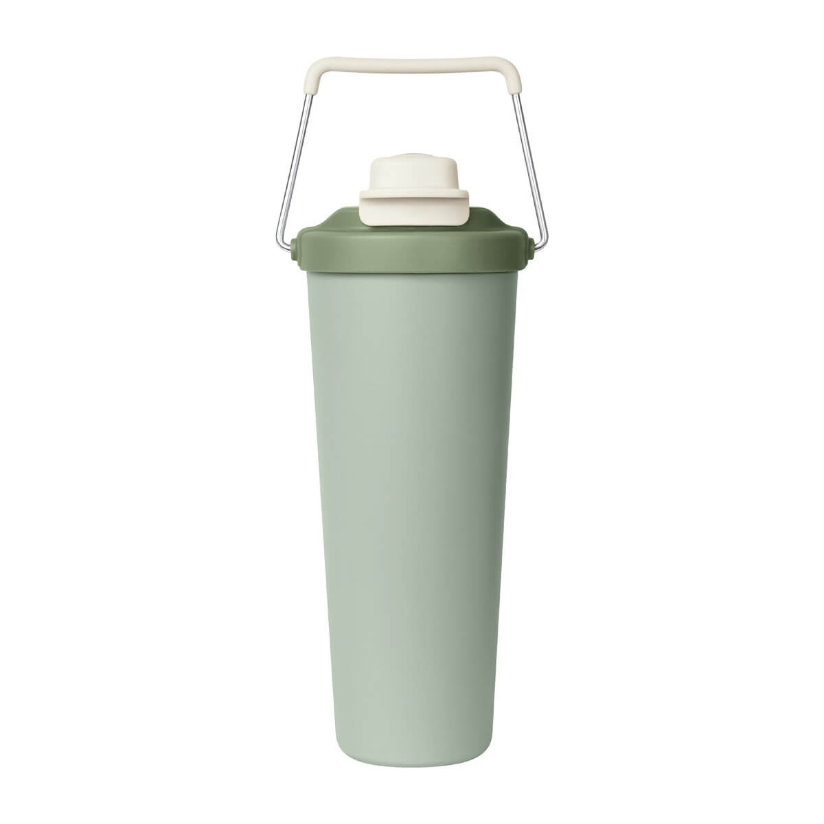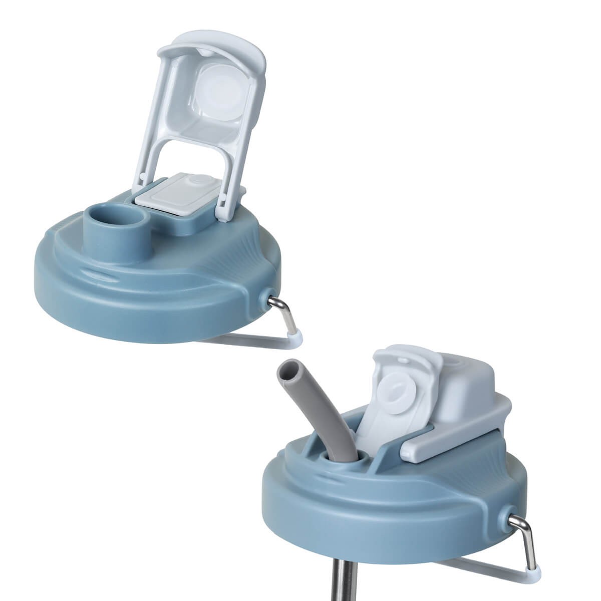Termo doble pared. Cerrado al vacio. Pared interna y externa acero inoxidable. Cuerpo con terminado rugoso. Tapa de plastico con sistema de rosca y doble sobretapa con cierre push, una con boquilla para beber y otra con ranura para popote. Agrega un asa m