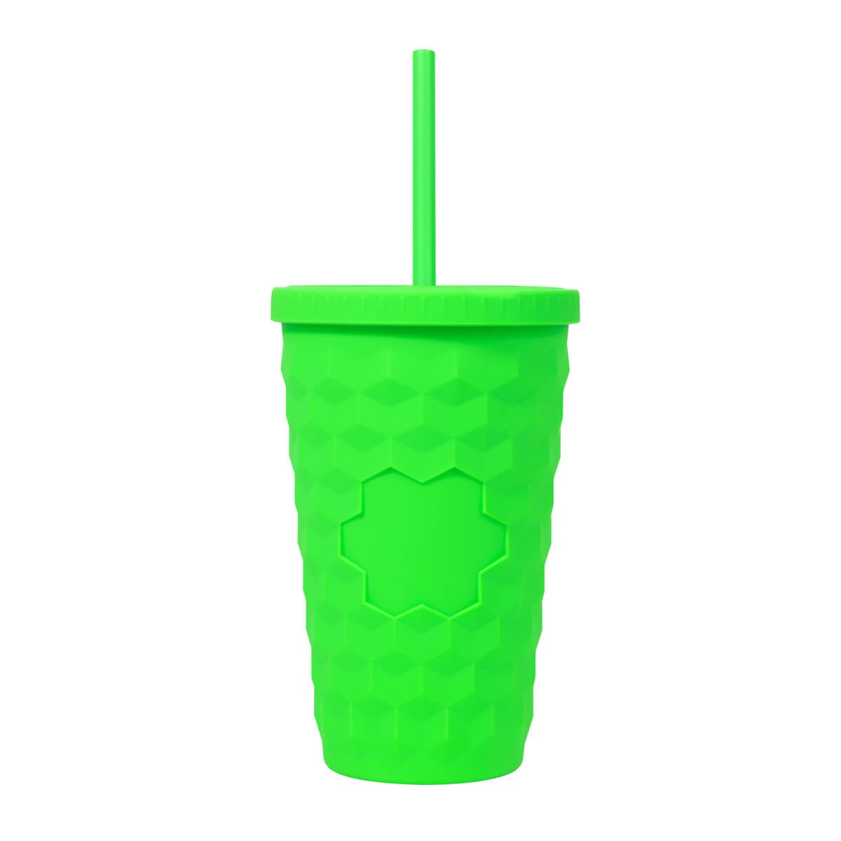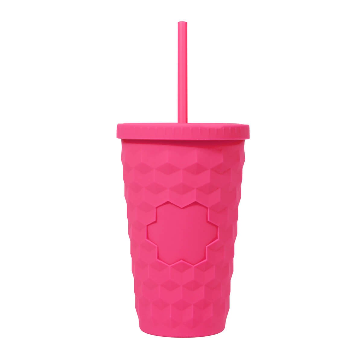 Vaso doble pared. Pared interna y externa de plastico. Tapa de plastico con sistema de rosca. Incluye popote. Cuerpo con terminado rubber que lo hace suave al tacto. Su diseno en relieve le da un toque unico y diferente, ademas permite un mejor agarre al