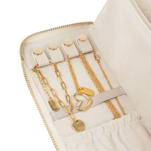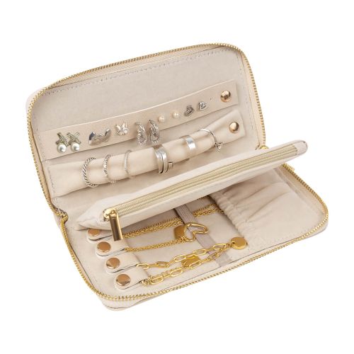 Organizador de joyería para viaje con diseño tipo cartera. Cuenta con múltiples compartimentos internos para organizar anillos, aretes, collares y pulseras, incluyendo ganchos metálicos, bolsillo con cierre y bandas con broches. Cierre completo y formato
