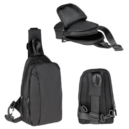 Bolsa de hombro de poliéster con compartimento principal; dos bolsillos frontales con cierre y correa ajustable.