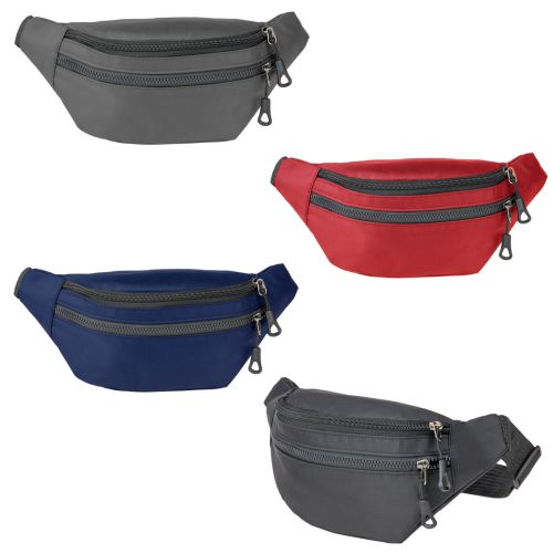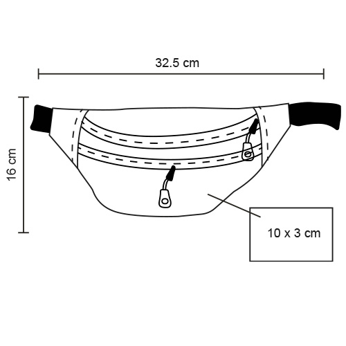 Cangurera de poliéster con compartimento principal; dos compartimentos secundarios con cierre y correa ajustable con broche.