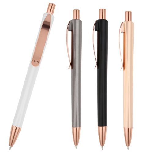 Bolígrafo de plástico con clip metálico y mecanismo de click.