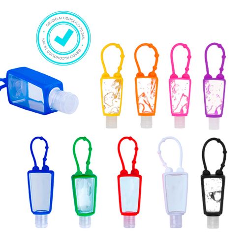 Gel antibacterial en botella con funda de silicón. Porcentaje de alcohol: 70 %.