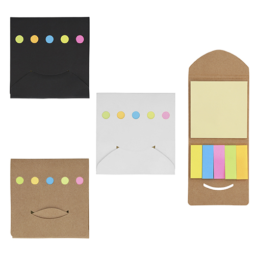 Sobre de cartón con notas y banderas adheribles.