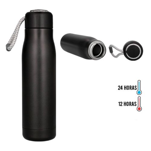 Termo con doble pared de acero inoxidable; con tapa enroscable plástica y correa de poliéster.