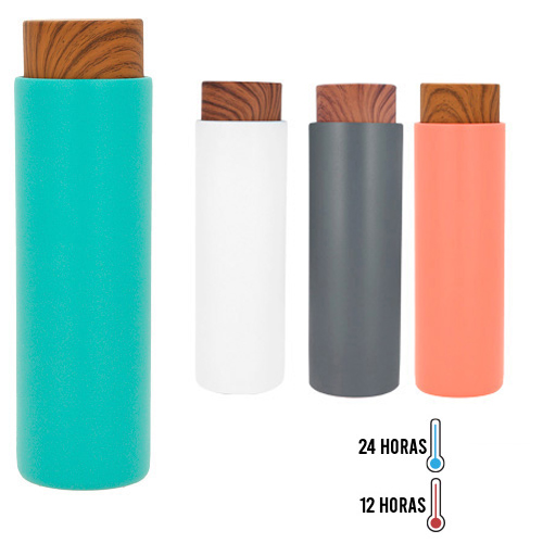 Termo de acero inoxidable de doble pared insulado al vacío con acabado rugoso. Incluye filtro infusor y tapa enroscable.
