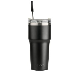 Termo con doble pared de acero inoxidable insulado al vacio con acabado rugoso base antiderrapante tapa de rosca con silicón y popote metálico. (Incluye limpiador para el popote).