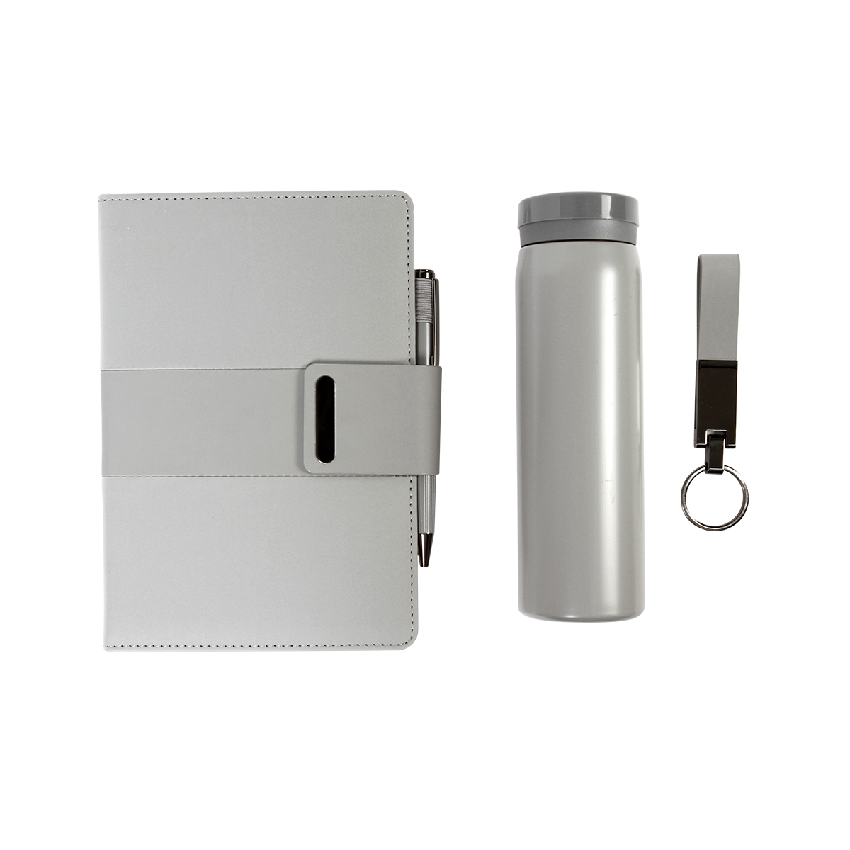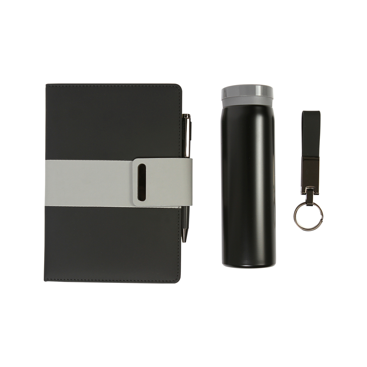 Set ejecutivo 4 en 1. Incluye libreta de 100 hojas de 80 g, bolígrafo tipo ball pen de acero inoxidable con tinta de escritura en color negro, llavero fabricado en PU y acero y termo de 350 ml fabricado en acero. Estilo y practicidad para el día a día. ¡E