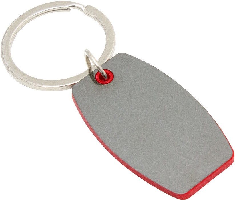 Refleja distinciónLlavero con forma ovalada. Estructura plástica de color con apliques de acero color gris gun de cada lado. Acabado brillante.Medidas: 5 x 3 x 0 35 cm. LLavero de Ø 3 5 cm x 0 2 cm. Materiales: Hierro ABS y Acero.