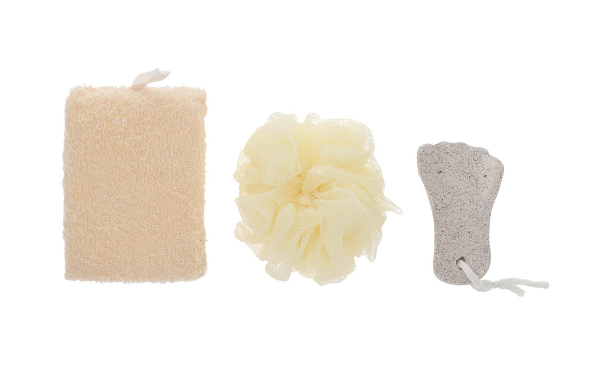 KIT DE BAñO VICTORIA(Incluye dos esponjas, una piedra pómez y bolsa.)