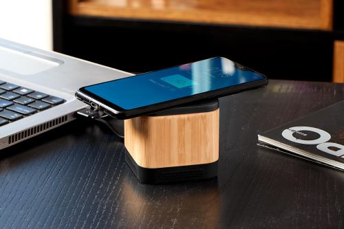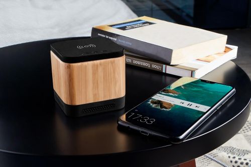 BOCINA RIOJA(Bocina bluetooth con batería recargable de 4 hrs de reproducción aproximadamente. Incluye función de carga inalámbrica al estar conectada. Incluye cable cargador USB)