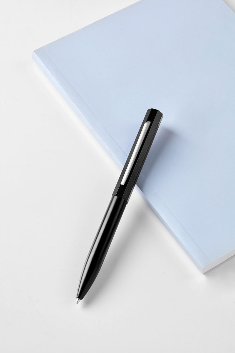 Mecanismo twist. Forma hexagonal en la parte superior del bolígrafo. Incluye estuche.