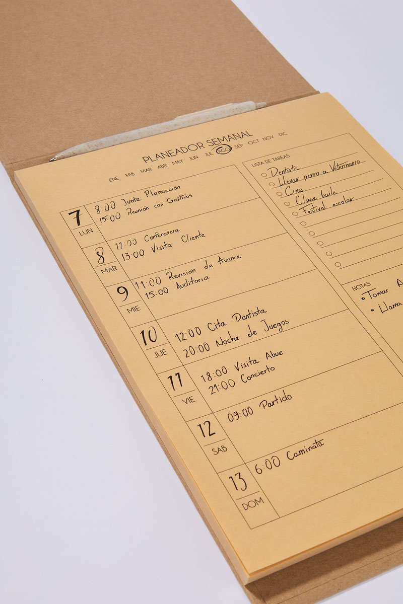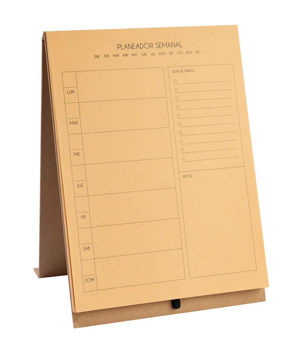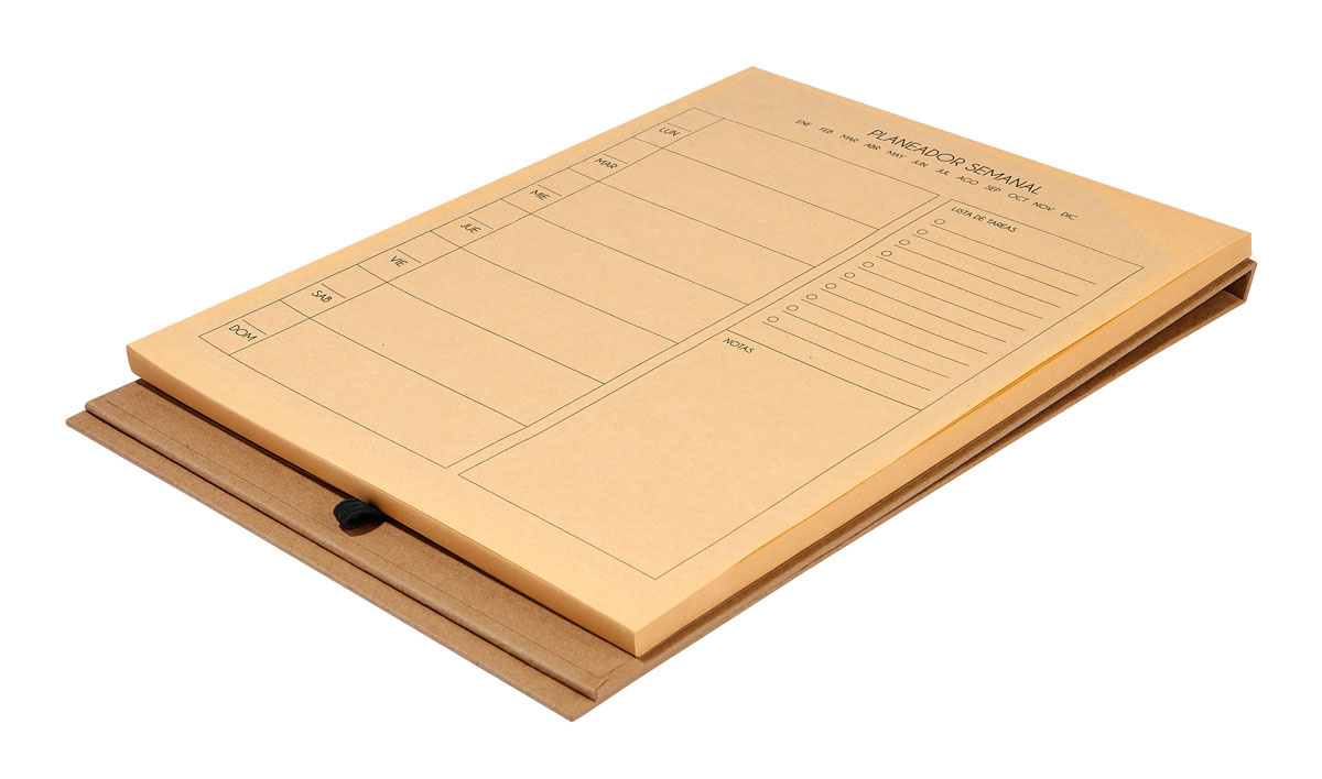 Libreta ecológica tamaño profesional con planeador semanal. Organiza fácilmente tus actividades y logra tus objetivos semanales. Incluye pasta dura de cartón, 80 hojas ecológicas y elástico para bolígrafo.