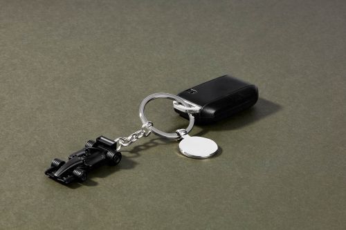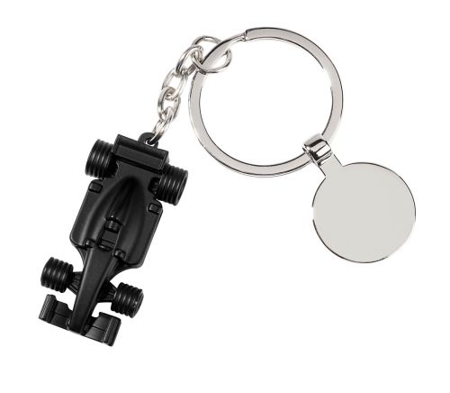 Llavero metálico en forma de coche, incluye placa metálica para grabado y caca individual.