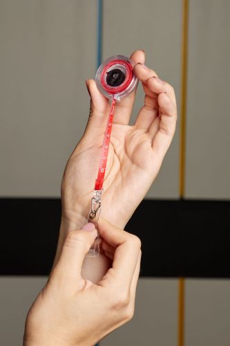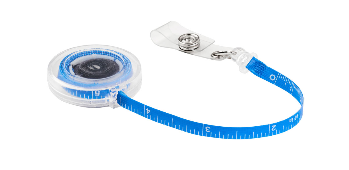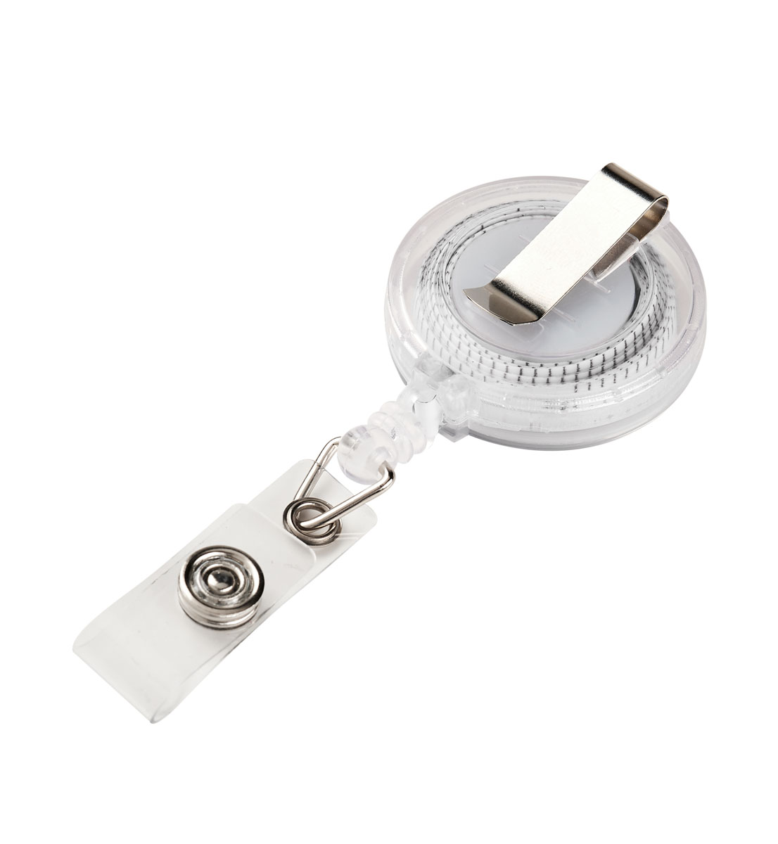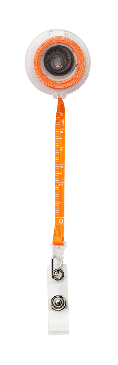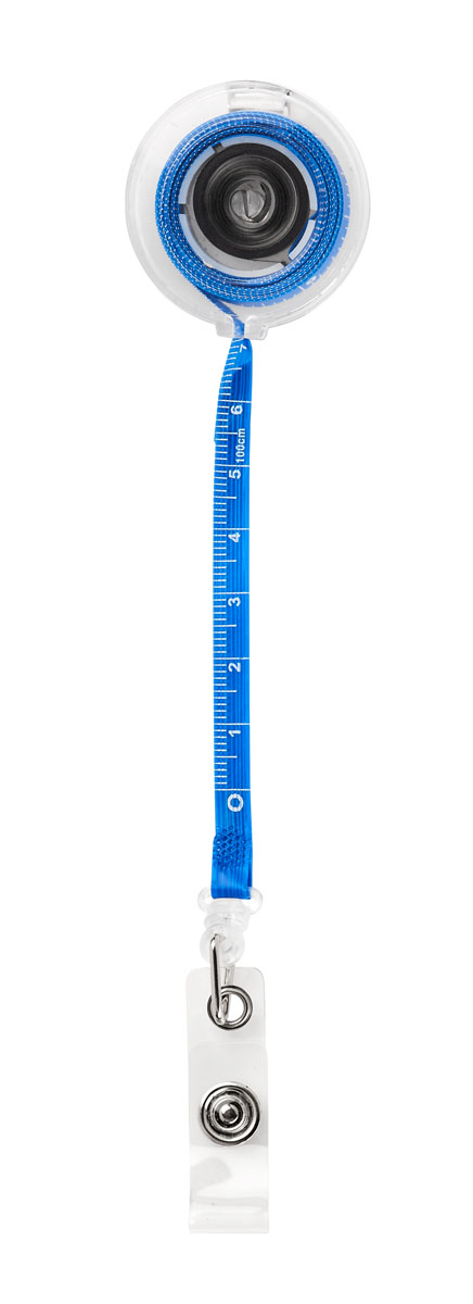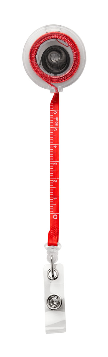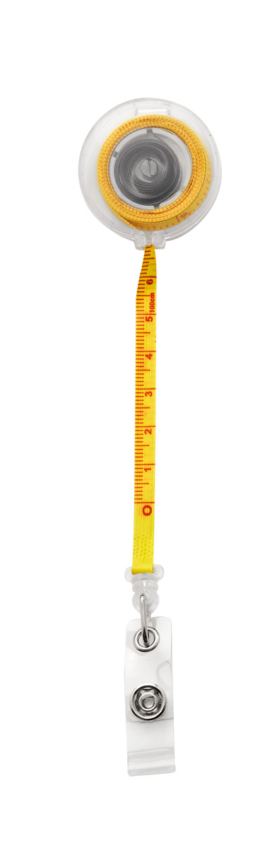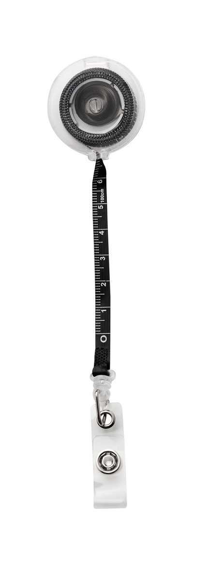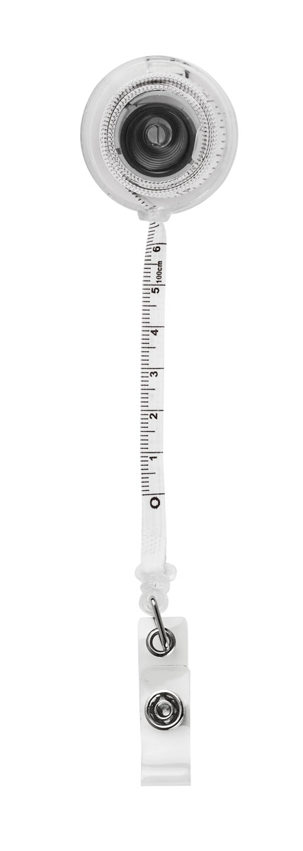 Portagafete retráctil con clip sujetador. Incluye flexómetro de 100 cm.