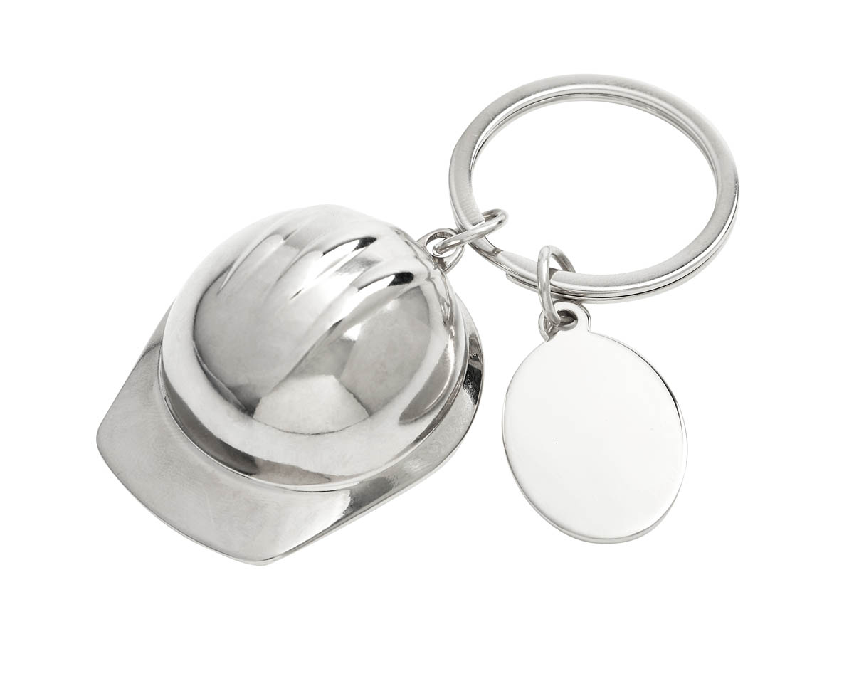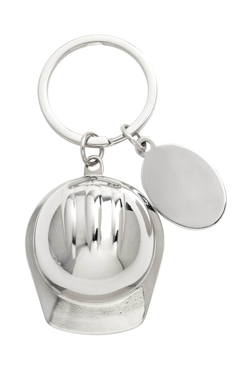 Llavero fabricado en metal con acabado cromado brillante. Por su diseño en forma de casco se convierte en el accesorio perfecto para los amantes de la industria de la construcción y seguridad. Además, incluye una placa ovalada para personalizar. Co
