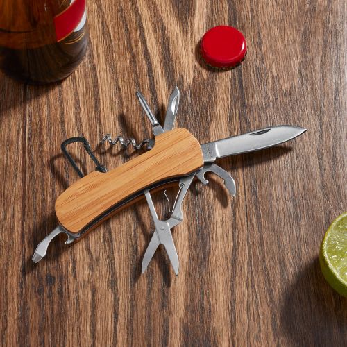 La navaja de bambú con 8 accesorios es una herramienta versátil y ecológica que te acompañará en todas tus aventuras. Sus accesorios incluyen una hoja afilada, abrelatas, tijeras, destornillador plano con abrebotellas, destornillador de cruz, limpi