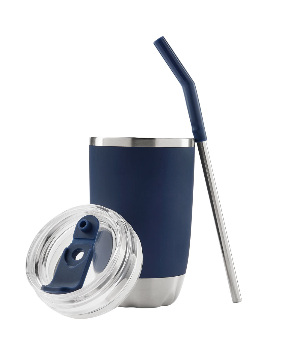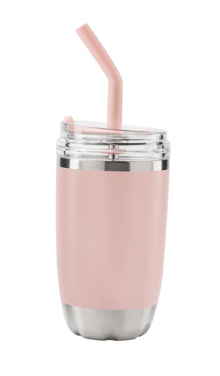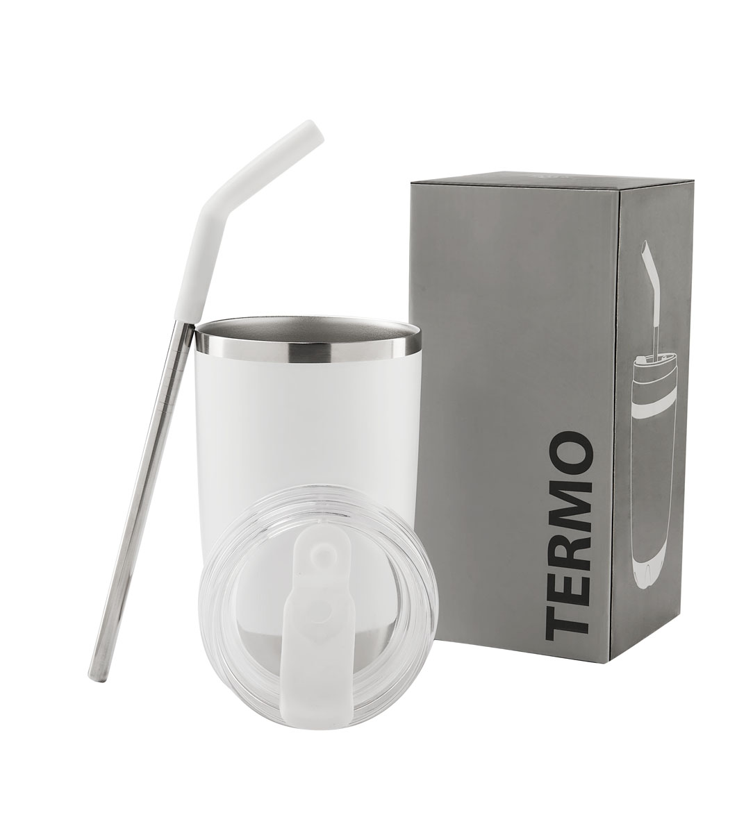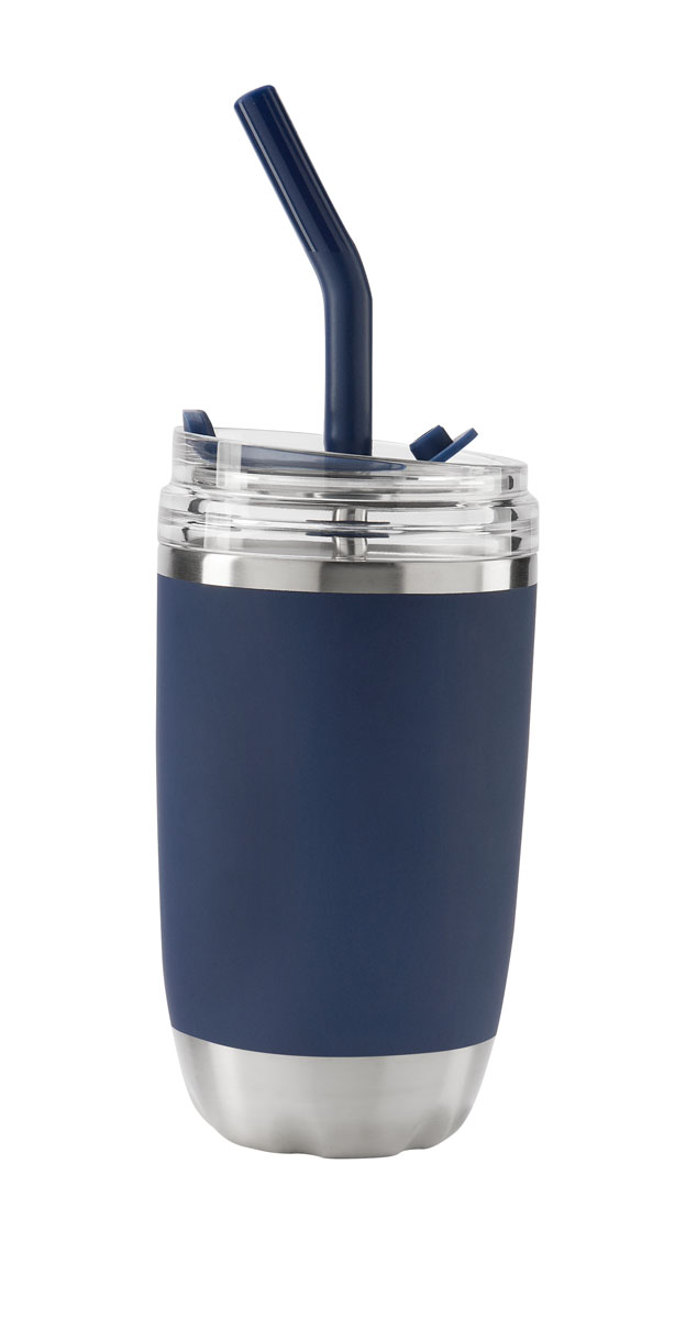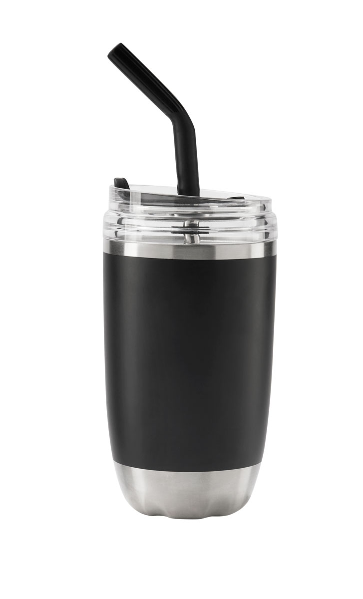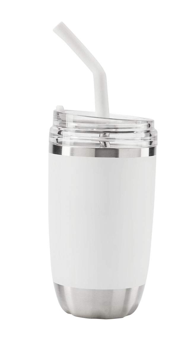 Doble pared. Cerrado al vacío. Pared interna y externa de acero inoxidable. Tapa push de plástico con sobretapa de silicón removible y ranura especial con tapón para popote. Incluye popote metálico con boquilla de silicón. Mantiene temperatura caliente 2