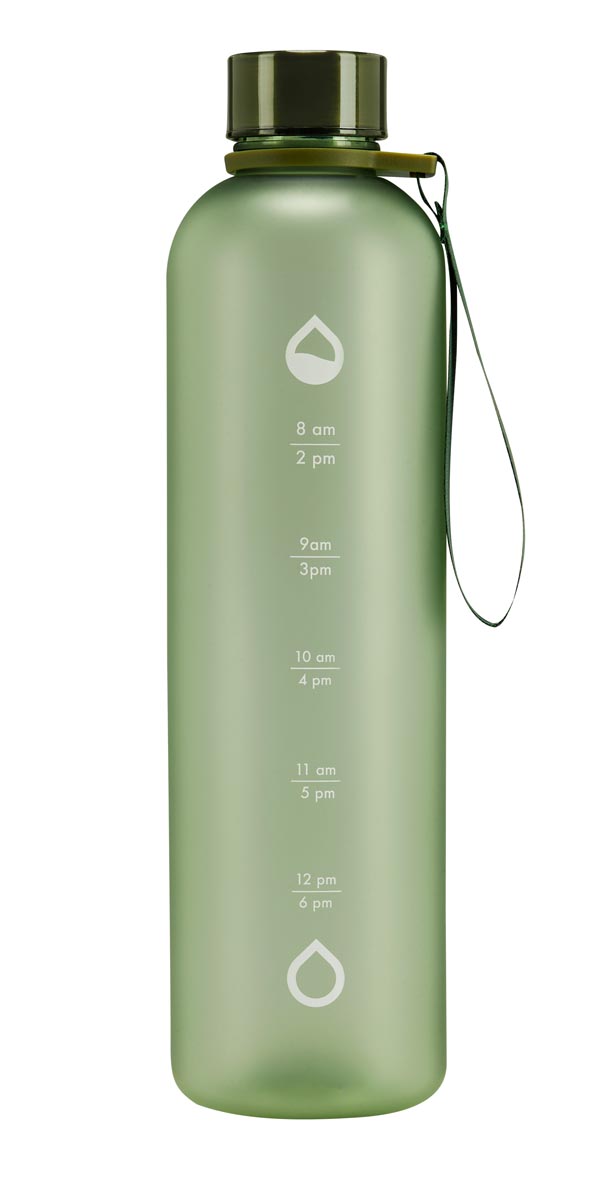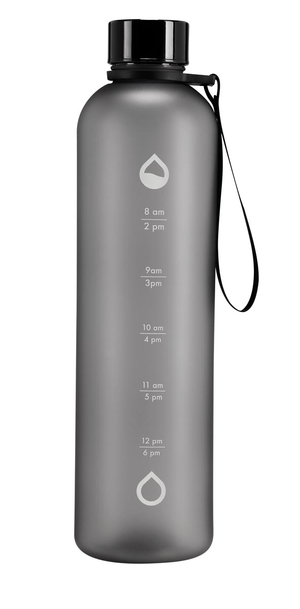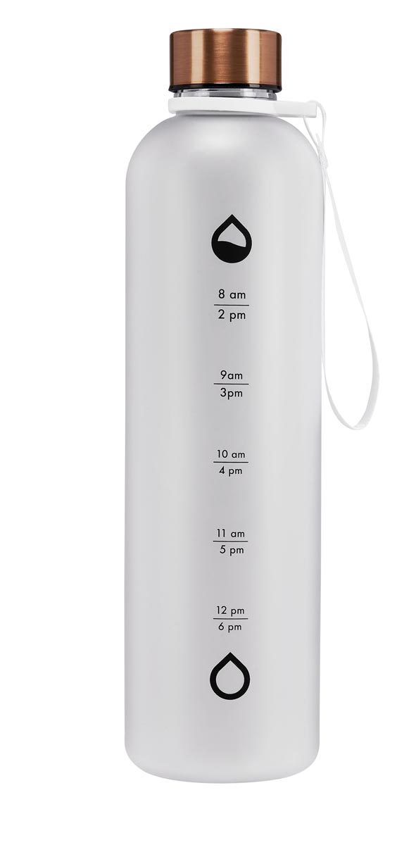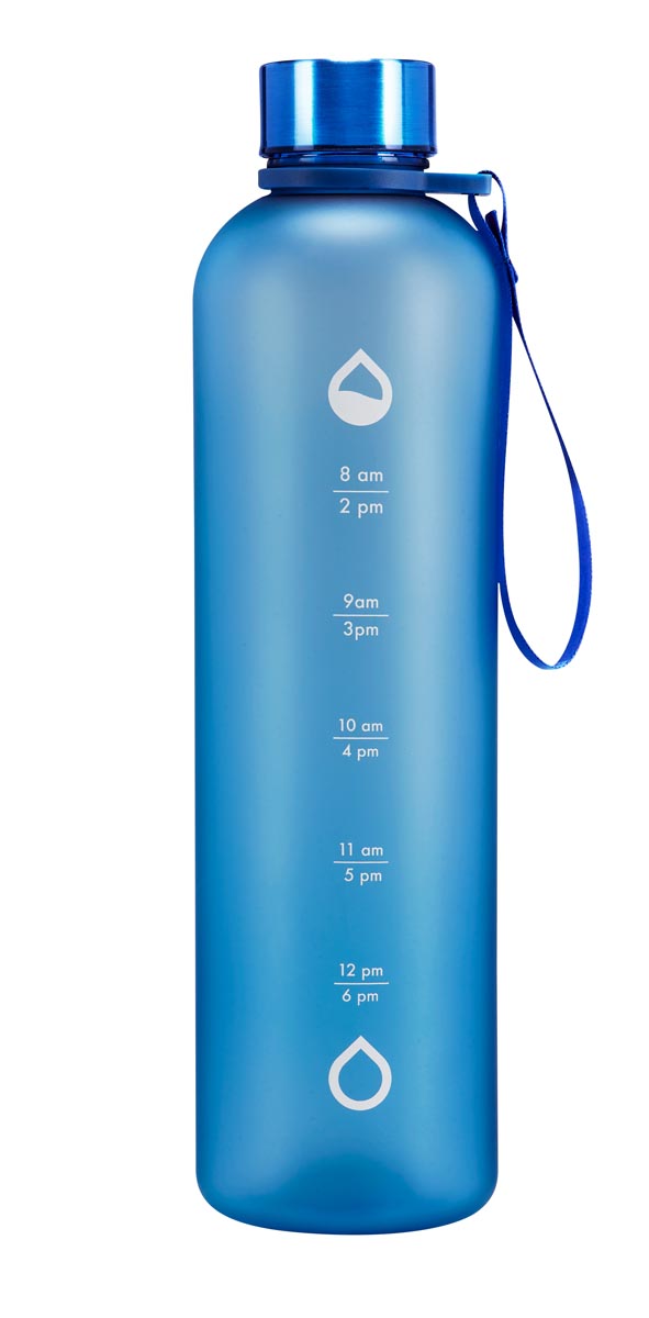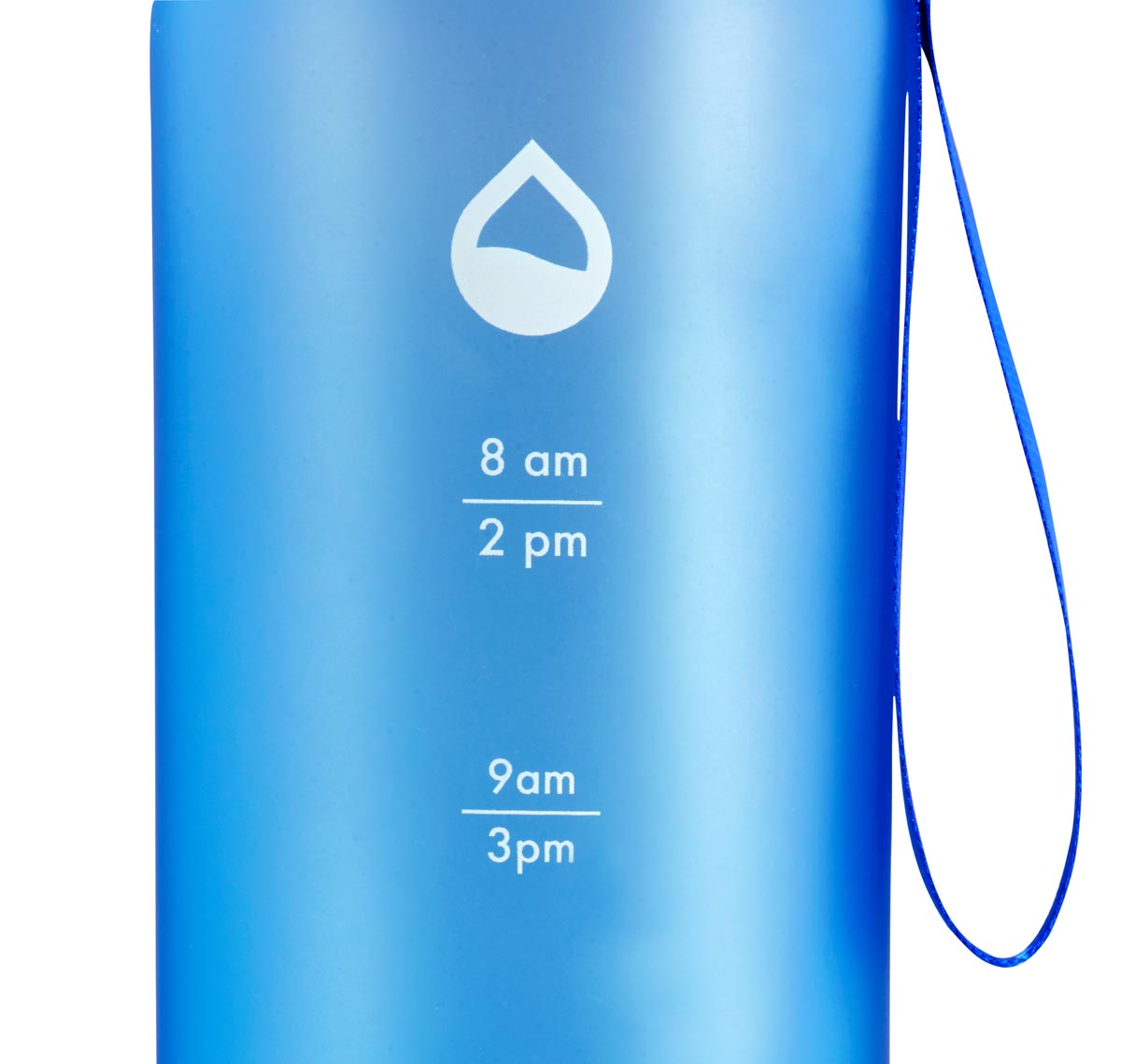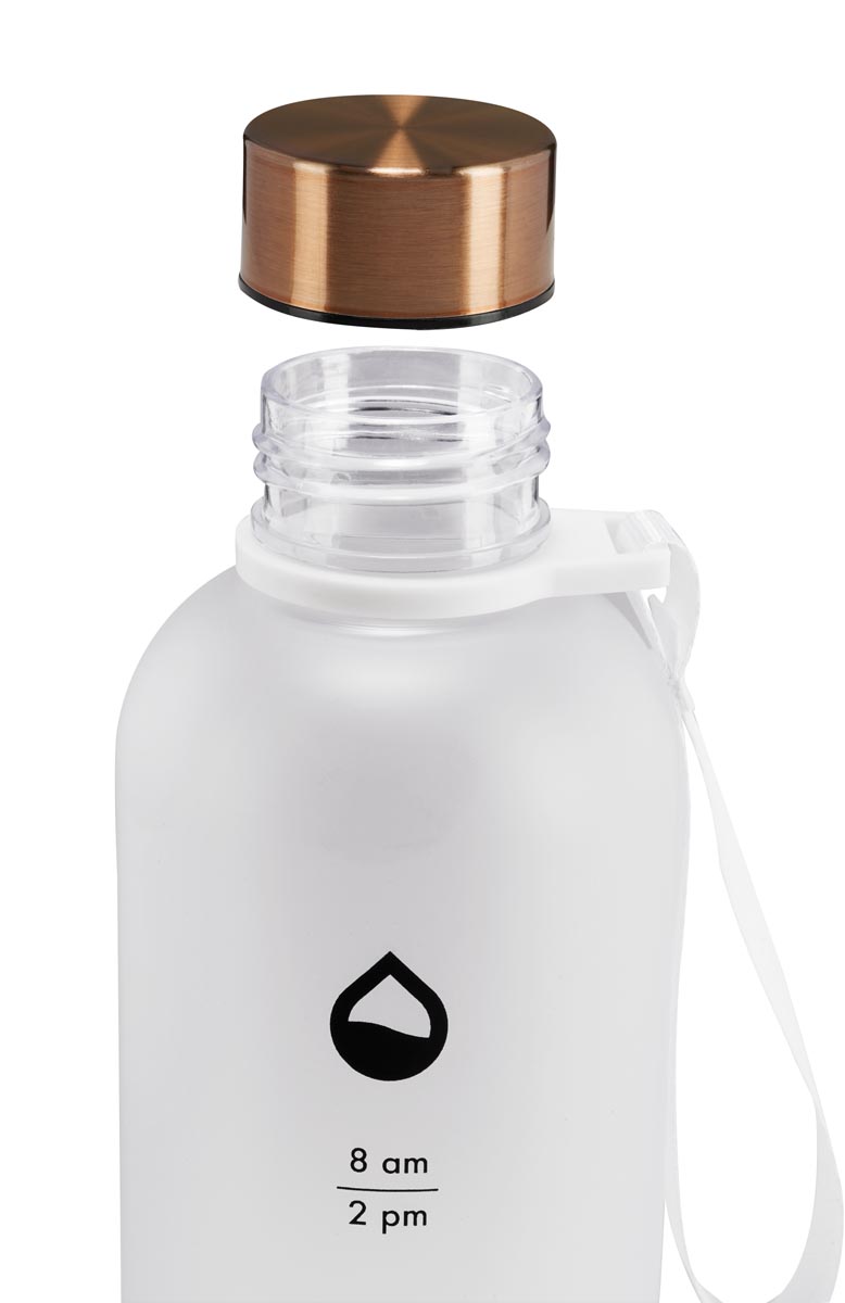 Tapa metálica con cierre de rosca. Aro de plástico con asa de tela. Cuerpo con terminado en color frosty. Incluye marcador de tiempo para motivar tus hábitos de hidratación. Incluye caja individual.
