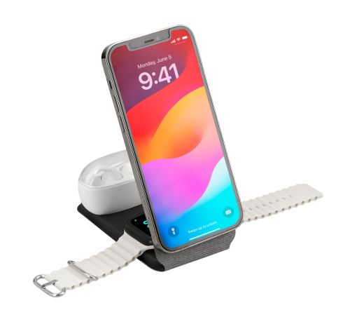 Cargador inalámbrico con diseño plegable. Cuenta con triple función: estación de carga para smartphone con tecnología magnética, reloj inteligente y audífonos de 2.5W / 5W /15W. Compatible con dispositivos que cuenten con tecnología de carga inalám