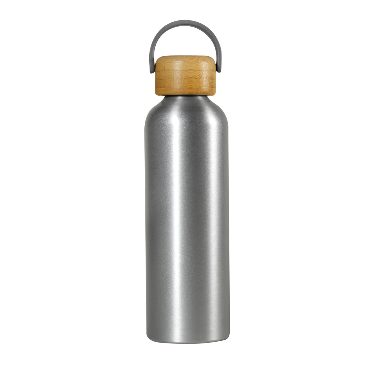 Cilindro metálico de una pared. Tapa de bambú con cierre de rosca y asa de plástico. Terminado mate. Incluye caja individual.