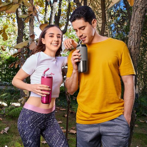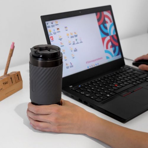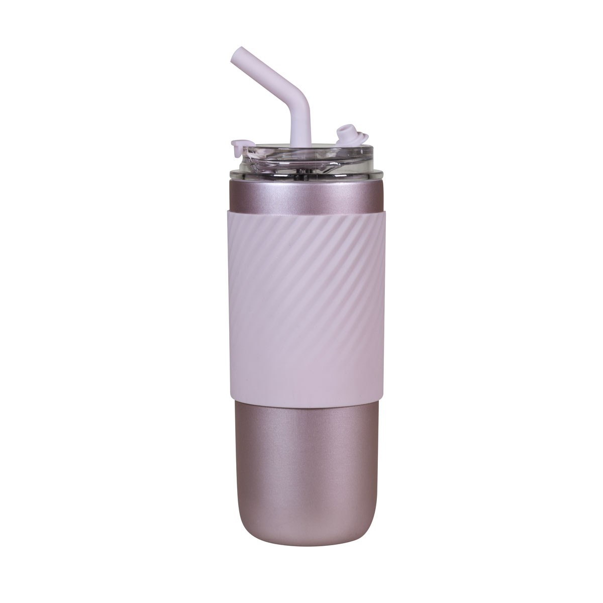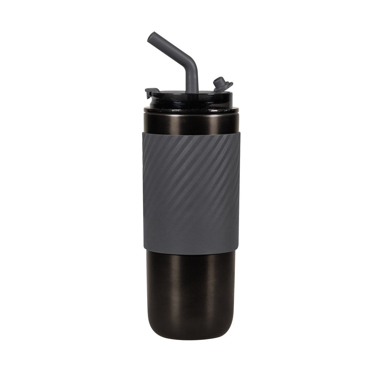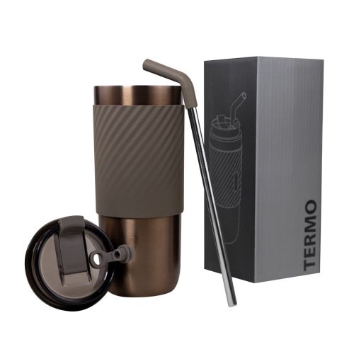 Doble pared. Cerrado al vacío. Pared interna y externa de acero inoxidable.Tapa con sistema de rosca, sobretapa de push y ranura especial con tapón para popote. Incluye popote metálico con boquilla de silicón. Banda de silicón antiderrapante. Mantiene la