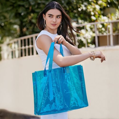 Bolsa con fuelle. Su material de plástico transparente, le da un toque justo de color y estilo. Sus asas de poliéster permite llevarla comodamente al hombro.