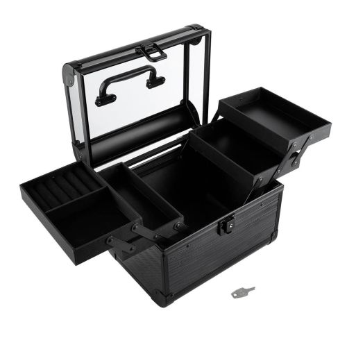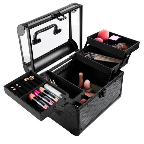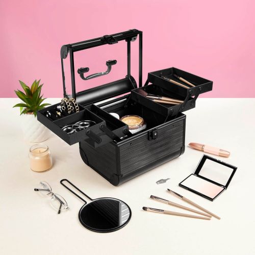 Neceser maletín multifuncional reforzado. Organiza todos tus productos de belleza de manera eficiente. Gracias a su diseño expandible, incluye 4 charolas; una especial para joyería. Cierre con broche metálico, incorpora una cerradura con llave para