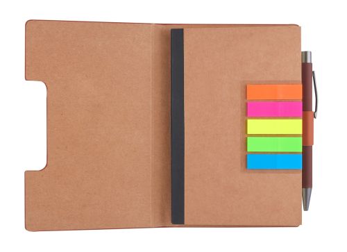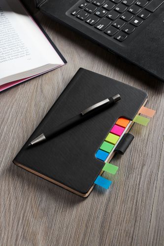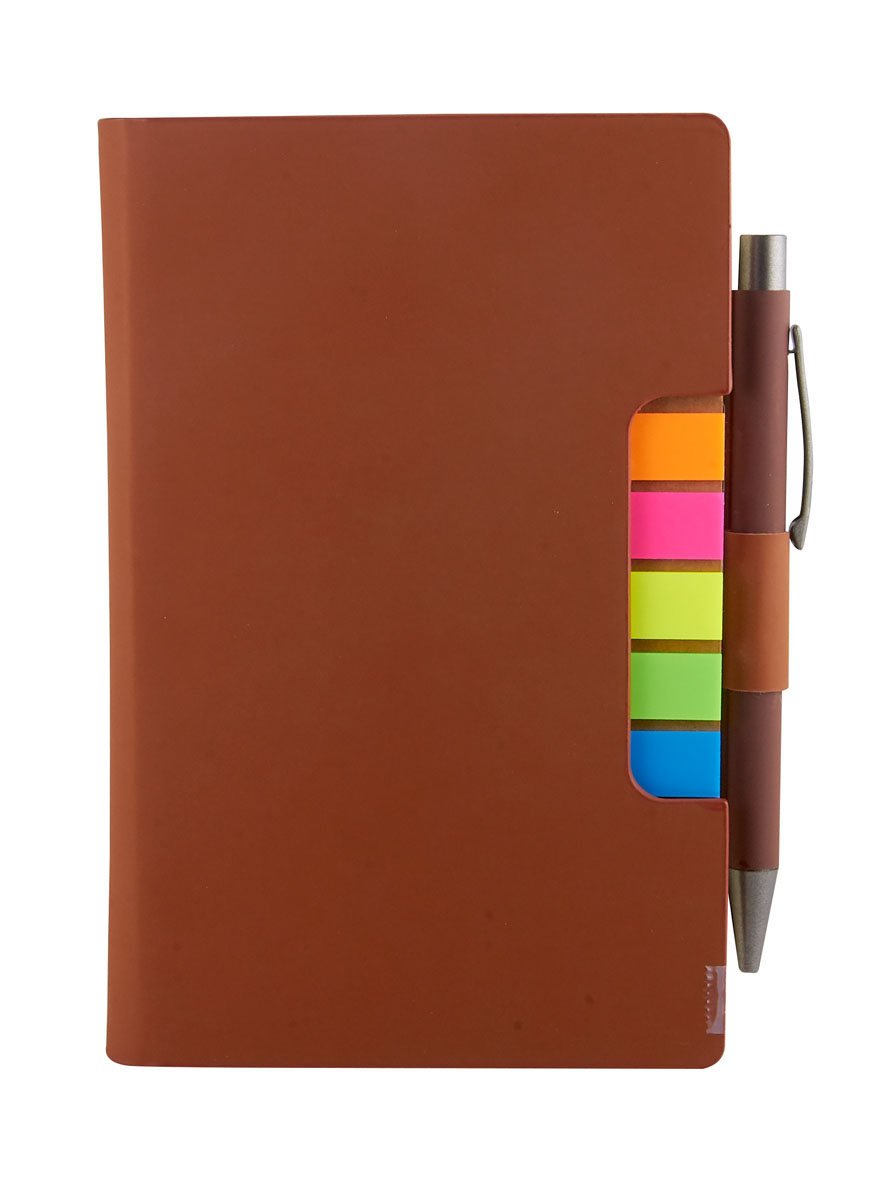 Libreta con 70 hojas de raya. Incluye bolígrafo y notas adheribles de colores.
