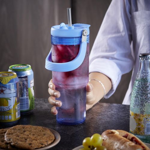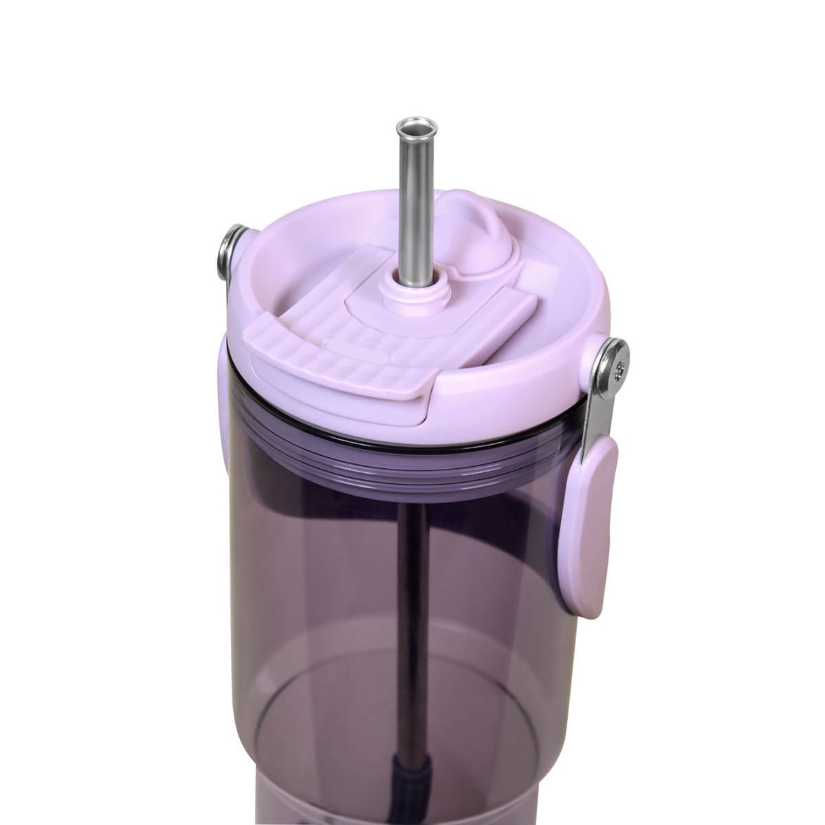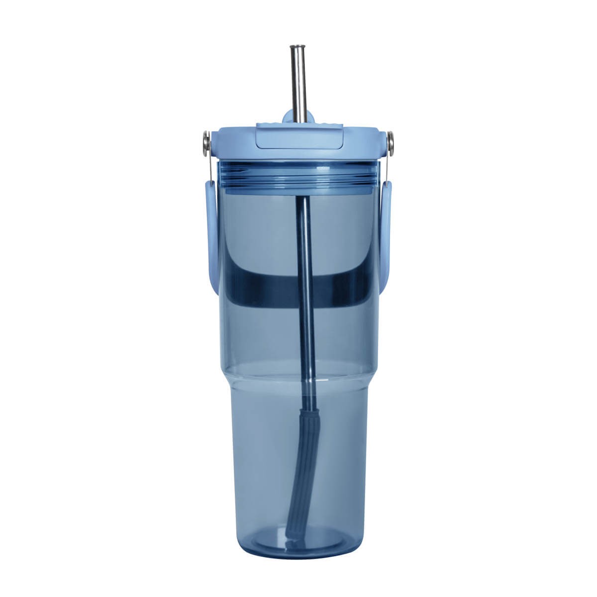 Termo de plástico de una pared. Incluye tapa con cierre de rosca que ofrece dos alternativas de uso,  sobretapa con sistema push y ranura especial para popote con  aditamento para cerrar y evitar derrames. Incluye popote metálico que cuenta con un mecanis