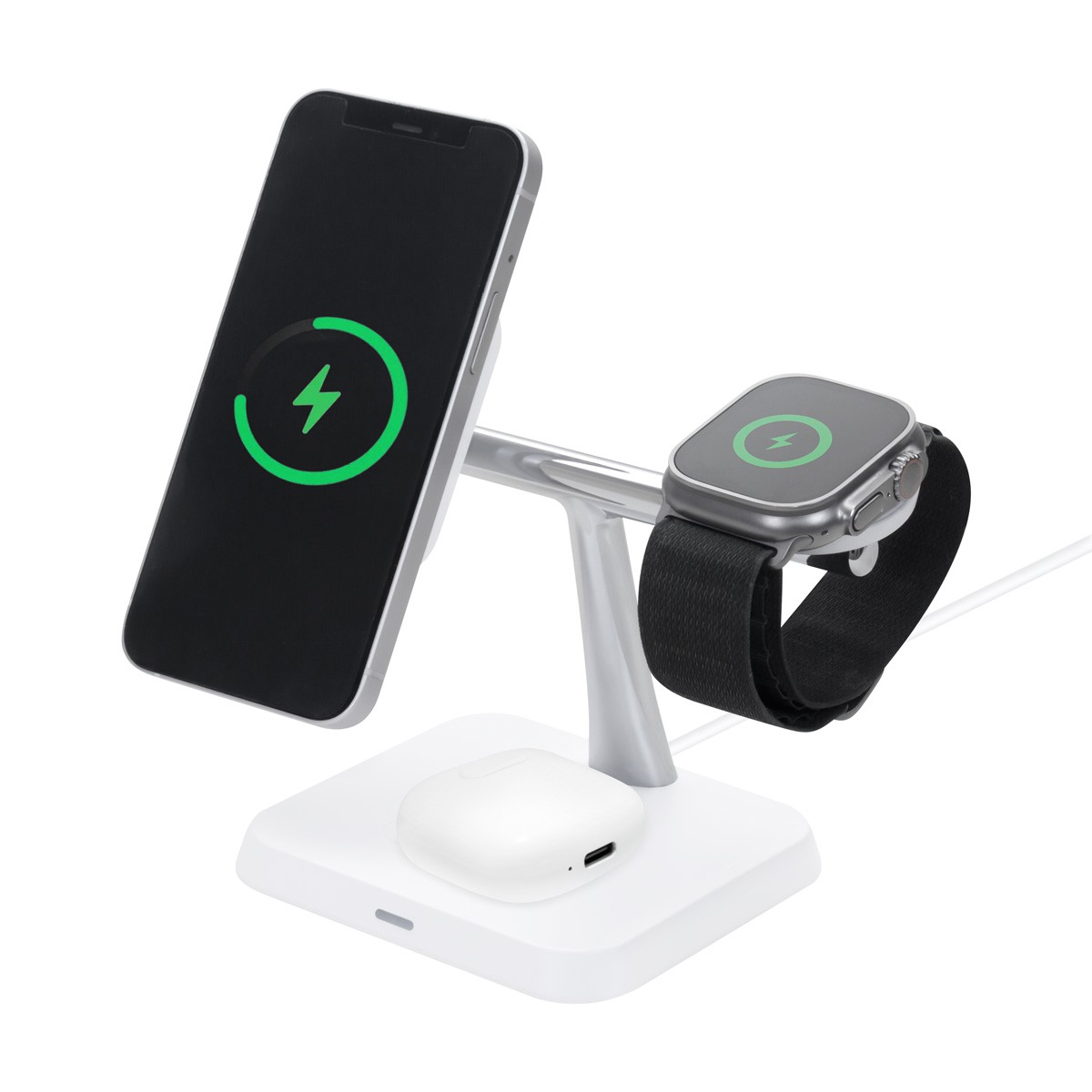 Estación de carga inalámbrica 3 en 1. Permite la carga simultanea de smartphone, earbuds y reloj inteligente. Velocidad de carga de 15 W / 5W / 3W. Incluye cable de 1m con conector tipo C y caja individual. Compatible con dispositivos que cuenten con tecn