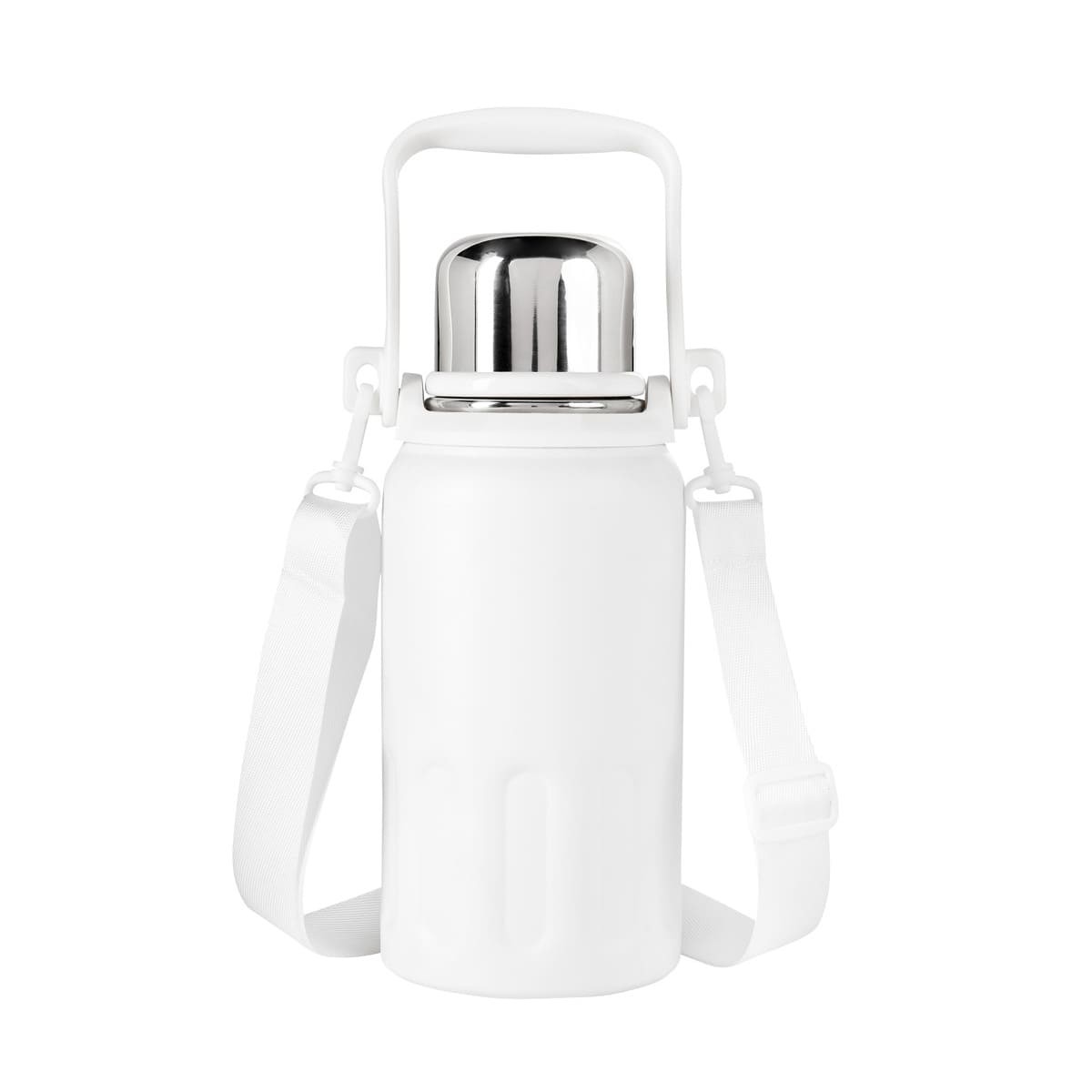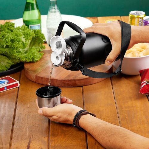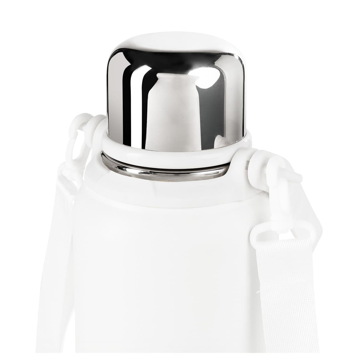 Termo doble pared. Cerrado al vacío. Pared interna y externa acero inoxidable y cuerpo con terminado tipo rugoso. Tapa de plástico con sistema de rosca, boquilla y botón de seguridad para mantener cerrado y sin derrames, incluye sobretapa metálica de rosc