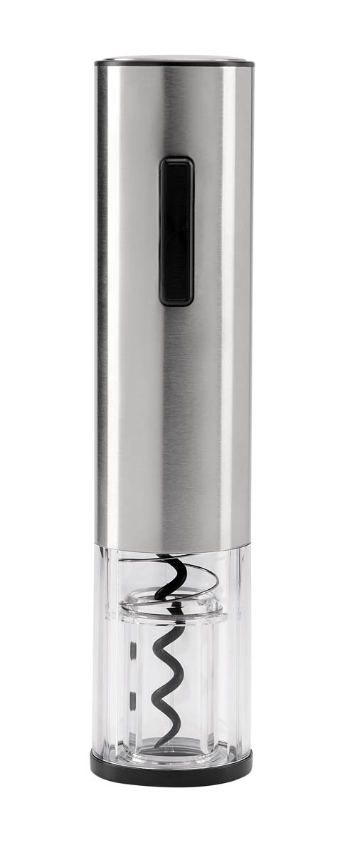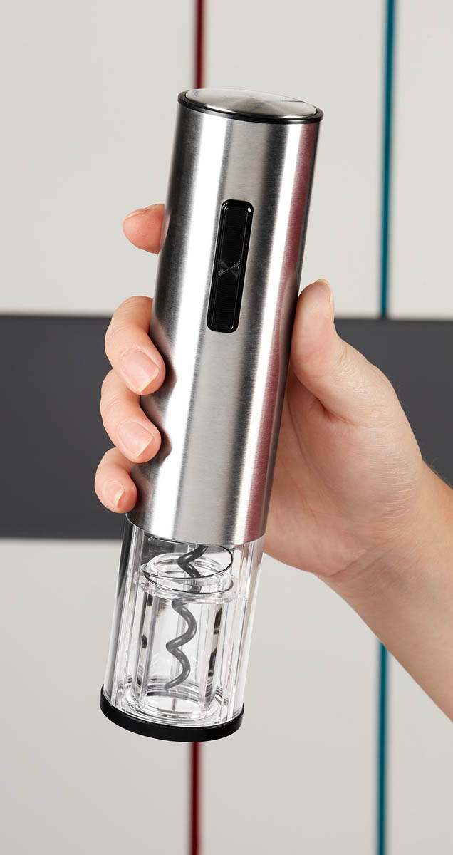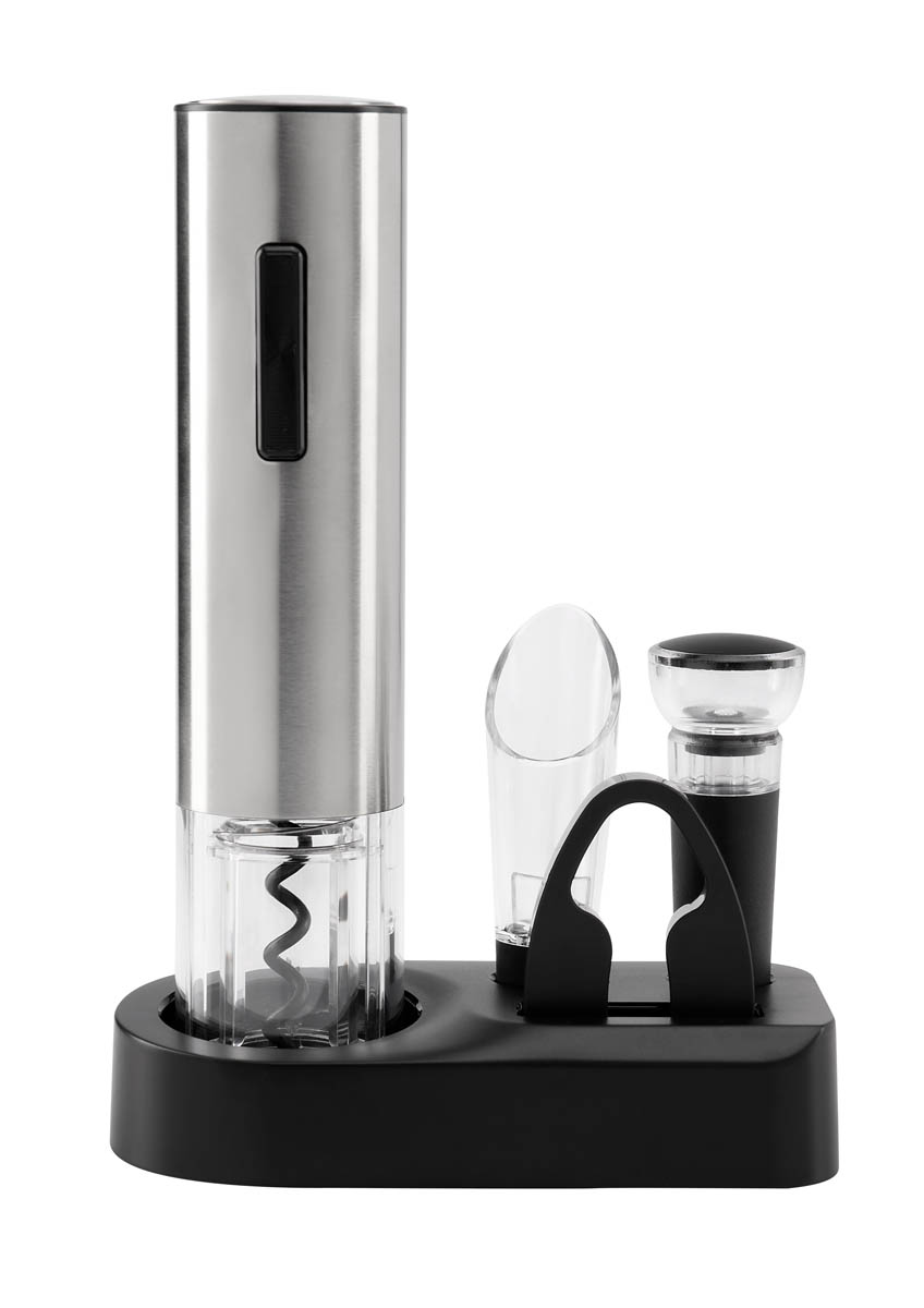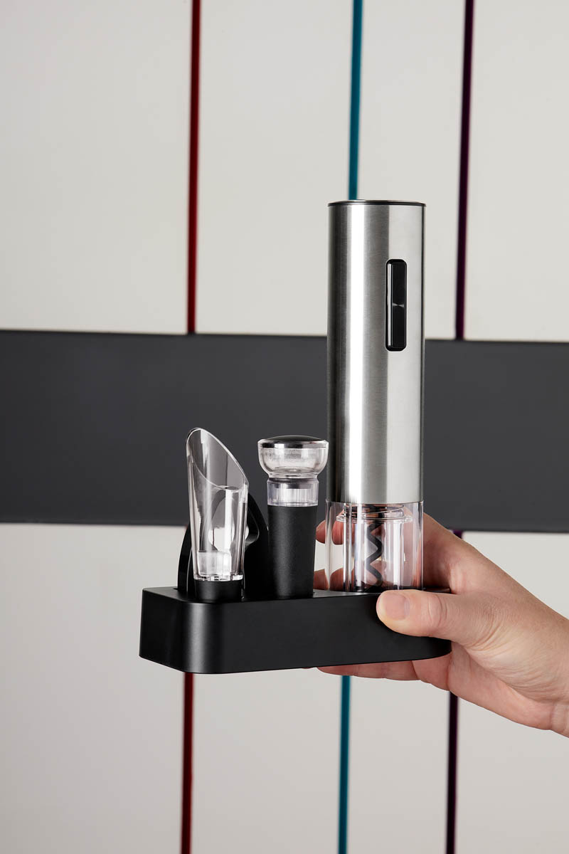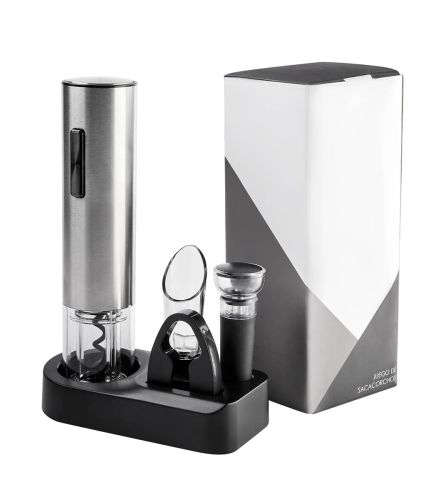 Set de sacacorchos eléctrico. Ideal para los amantes del vino. Contiene 1 sacacorchos con batería recargable y puerto tipo C, 1 cortador de papel aluminio, 1 vertedor para evitar salpicaduras, 1 tapón protector de vacío y 1 base para organizar los diferentes accesorios. Incluye cable auxiliar, manual de uso y caja individual.