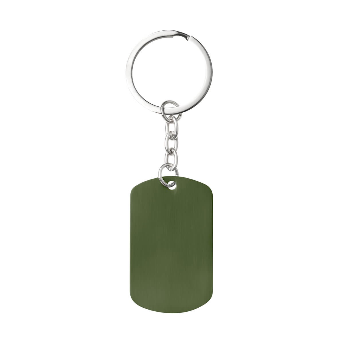 Llavero con placa metalica tipo militar. Diseno ligero, delgado y con acabado satinado.