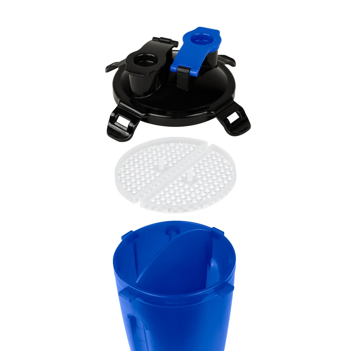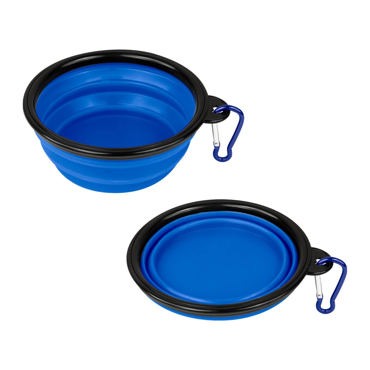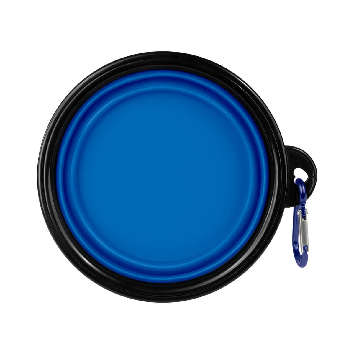 Vaso para portatil 2 en 1 para mascotas. Una pared de plastico, con tapa hermetica, 4 broches de seguridad y 2 boquillas con mecanismo tipo push. Cuenta con compartimentos separados para agua (350 ml) y alimento (250 g), Incluye un plato plegable de sil