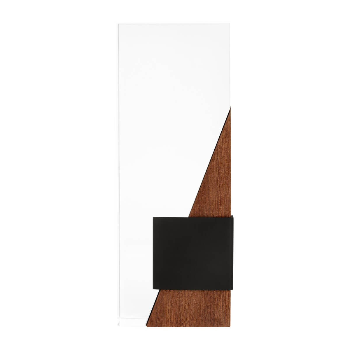 Reconocimiento asimetrico que combina materiales como vidrio, madera y metal, destacando un diseno moderno y minimalista. Cuenta con una placa metalica para su facil grabado. Destaca un evento memorable, una mencion honorifica o celebracion especial. Incl